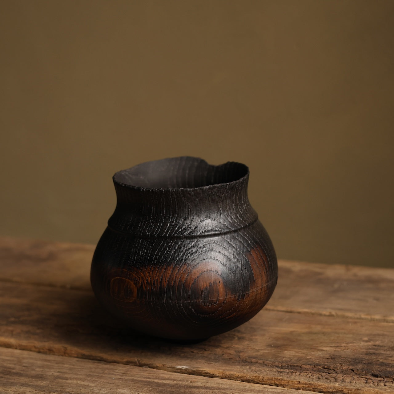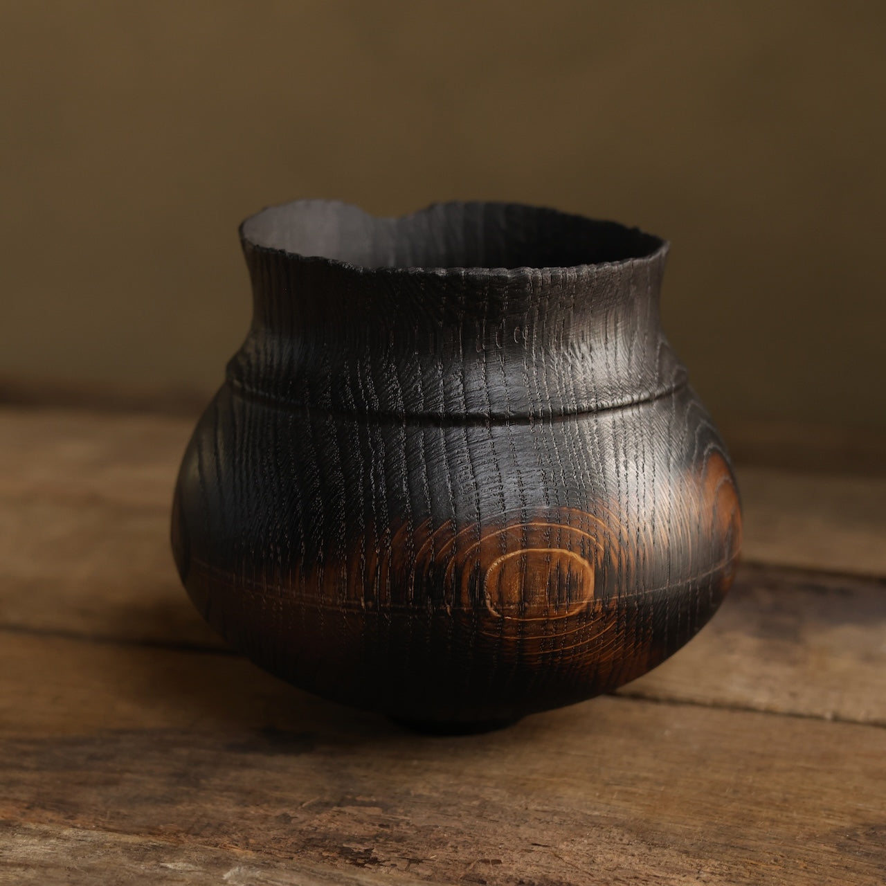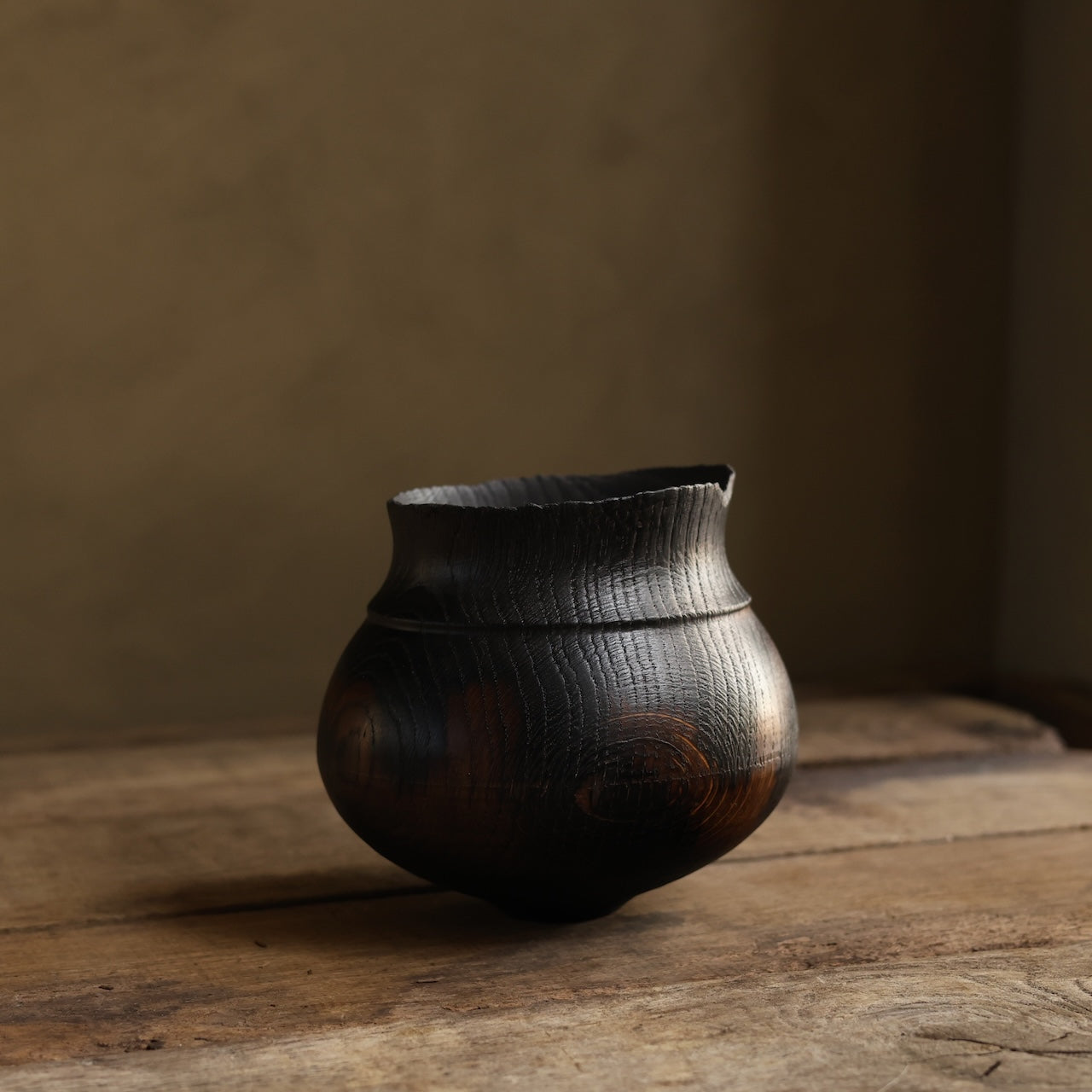 Patinated Oak vessel treated with lime and a touch of fire before coating with danish oil and wax and burnishing with a stiff brush.