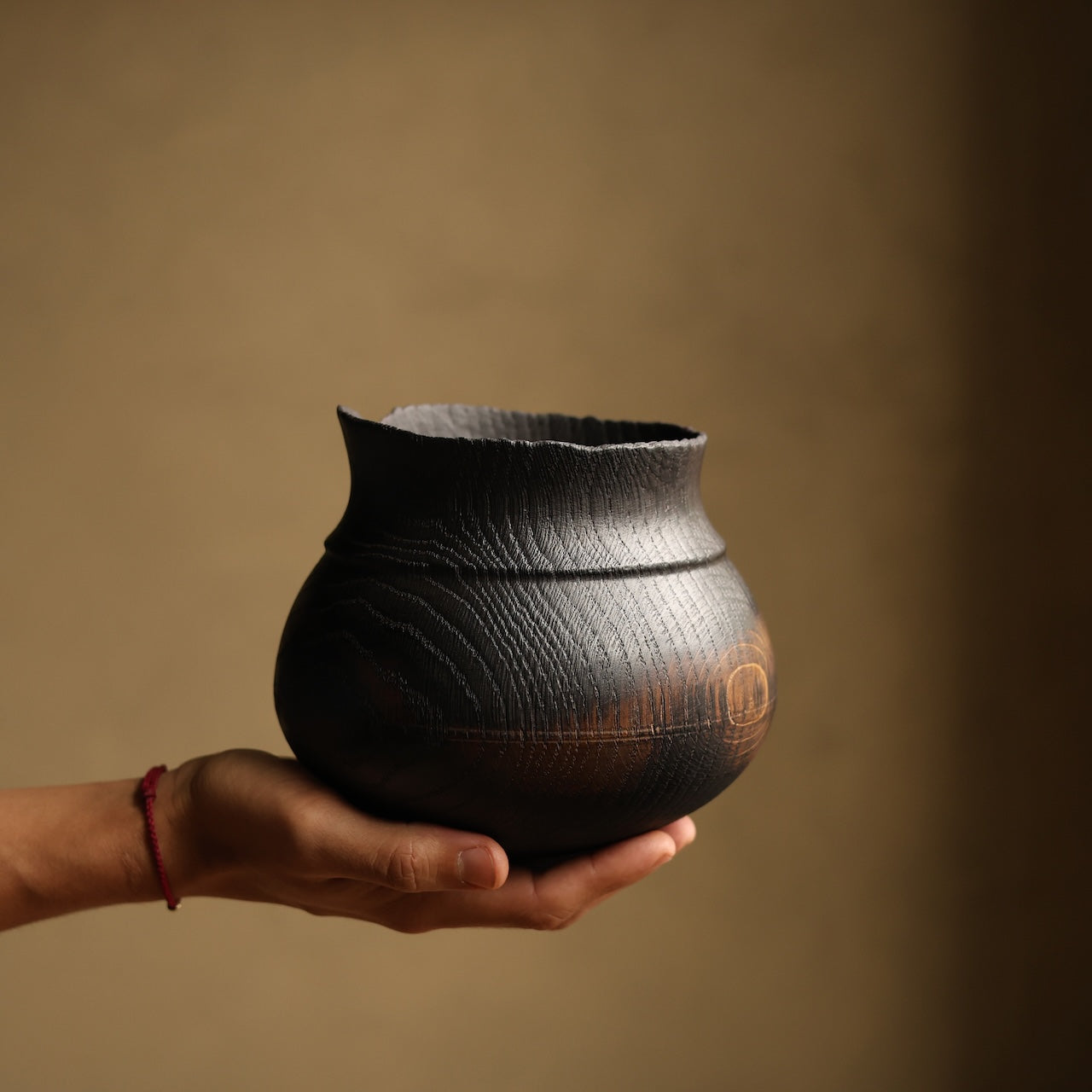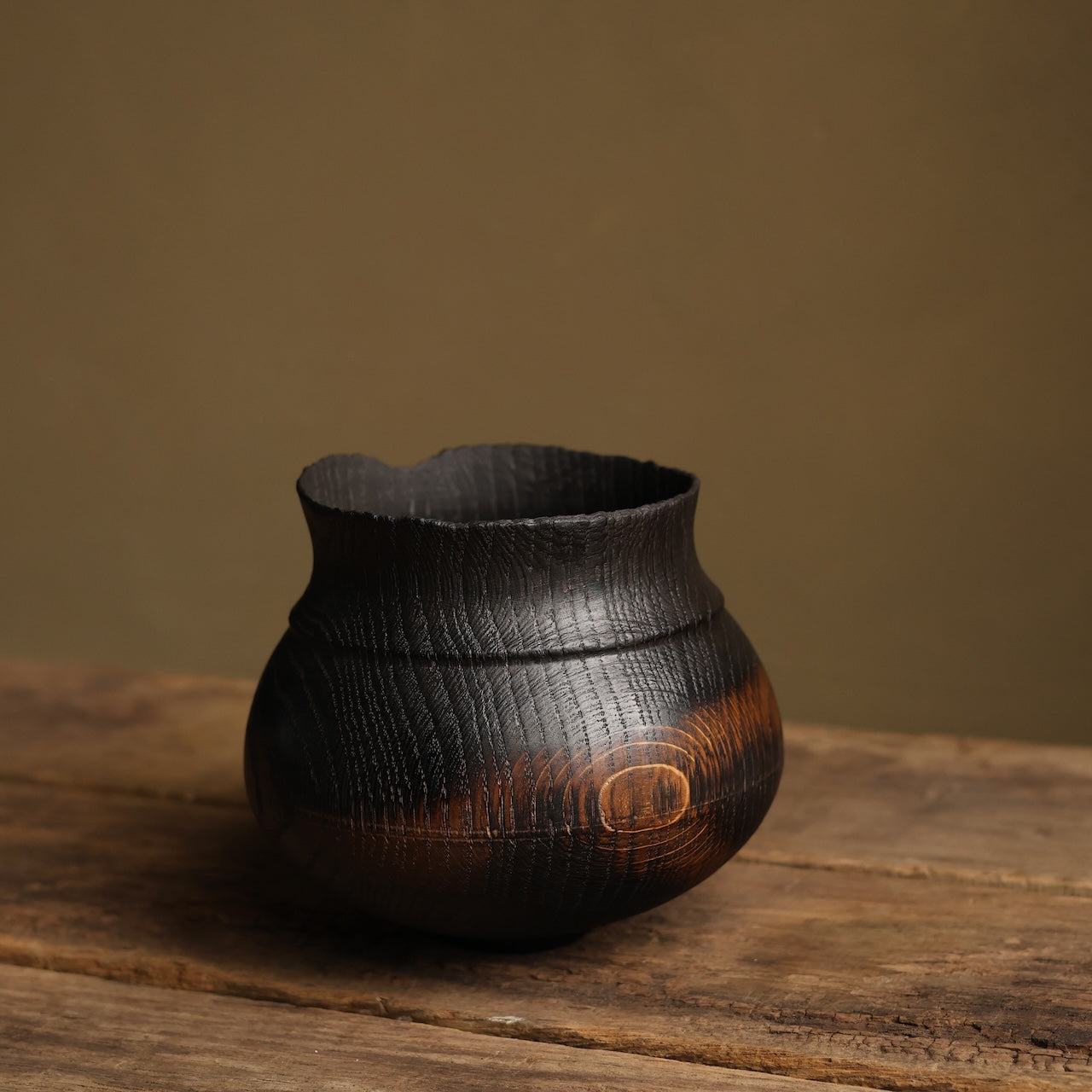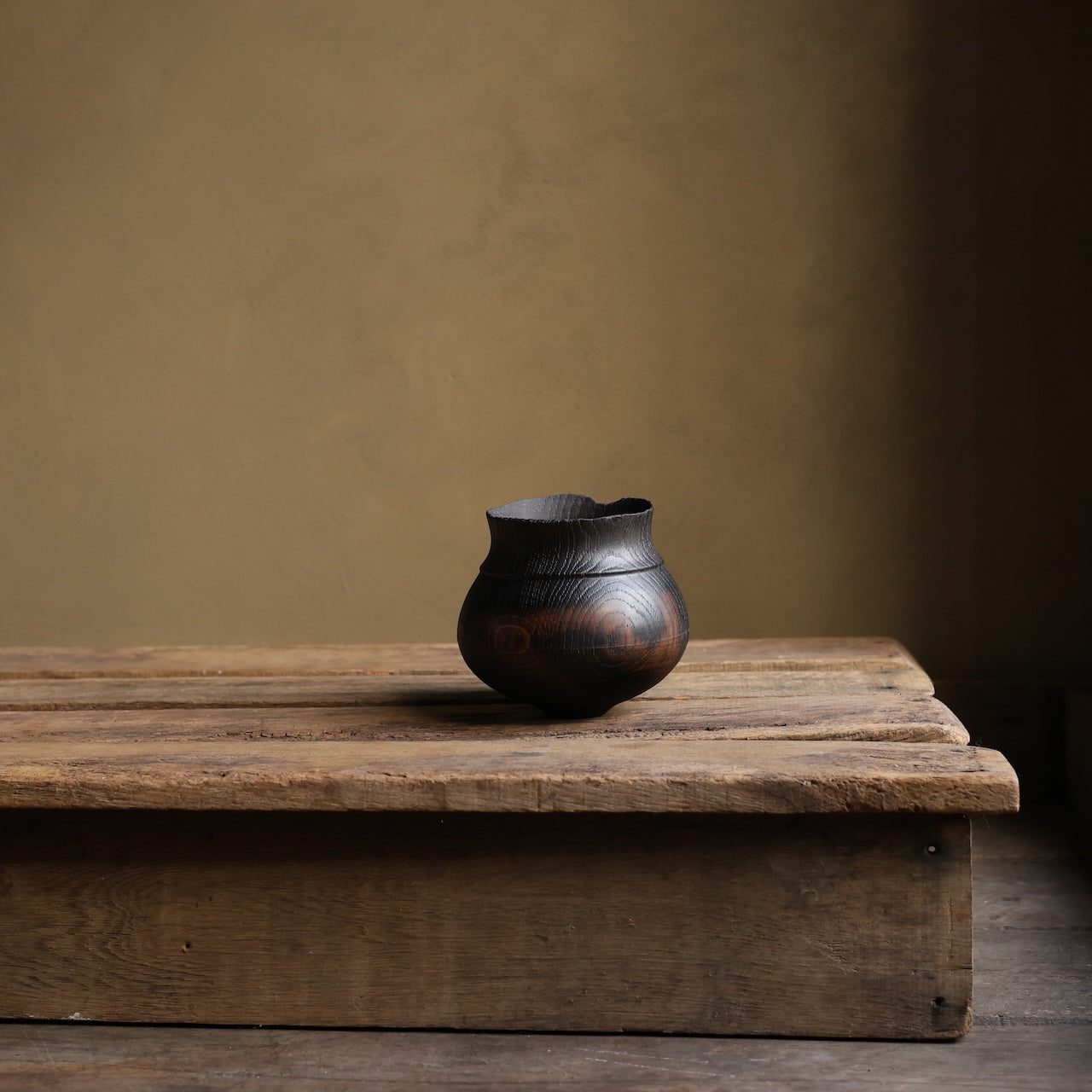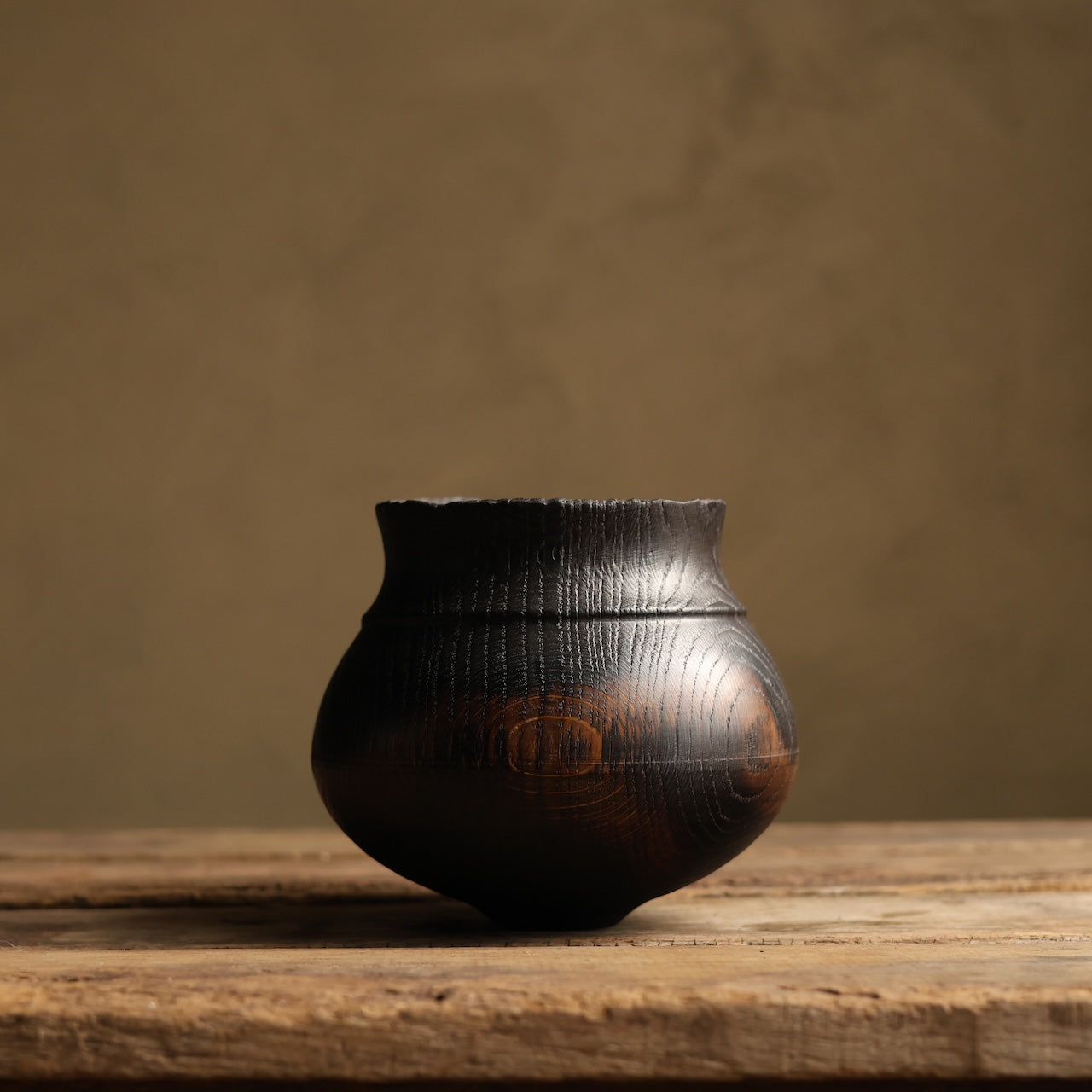 Patinated Oak vessel treated with lime and a touch of fire before coating with danish oil and wax and burnishing with a stiff brush.