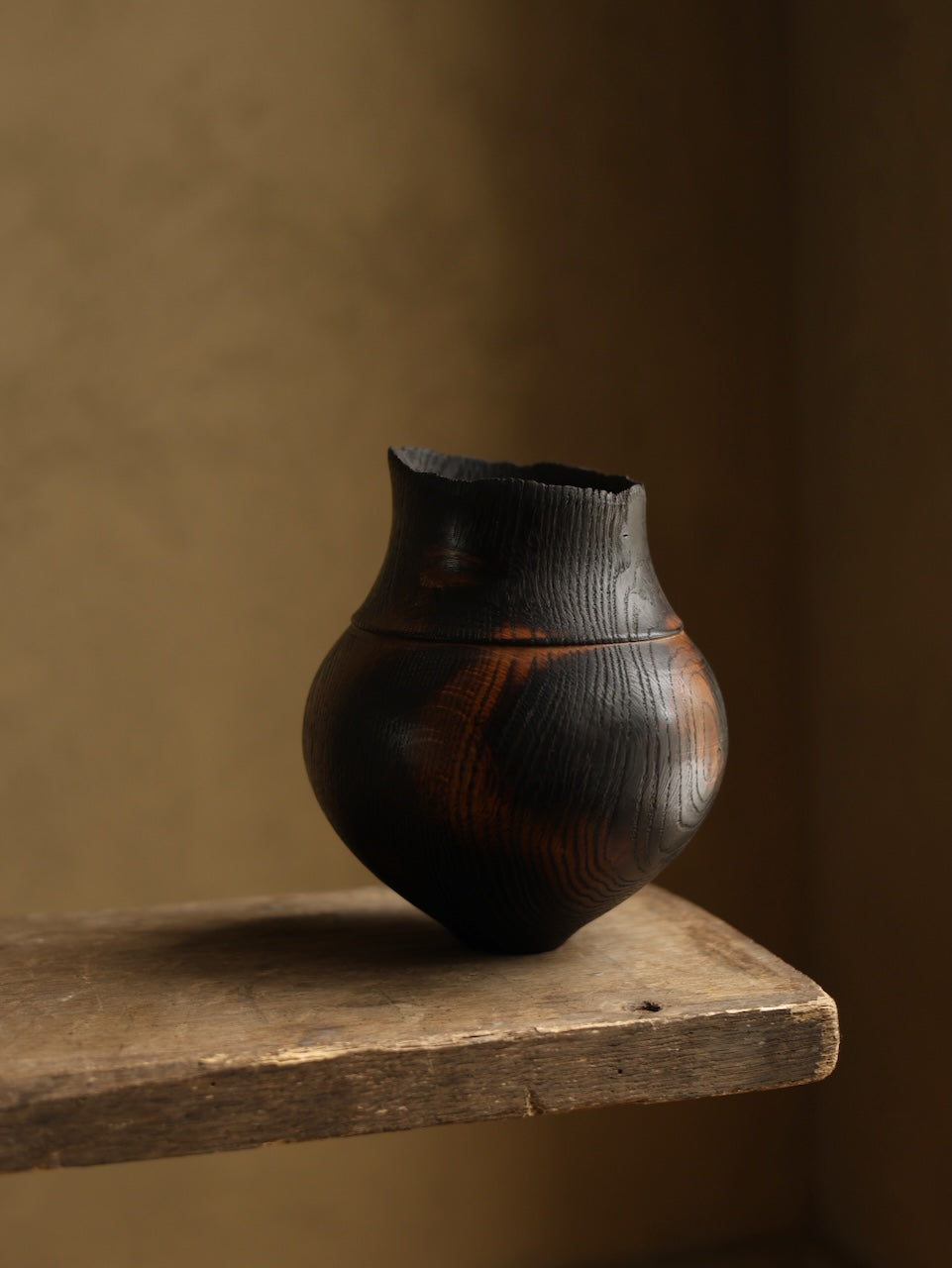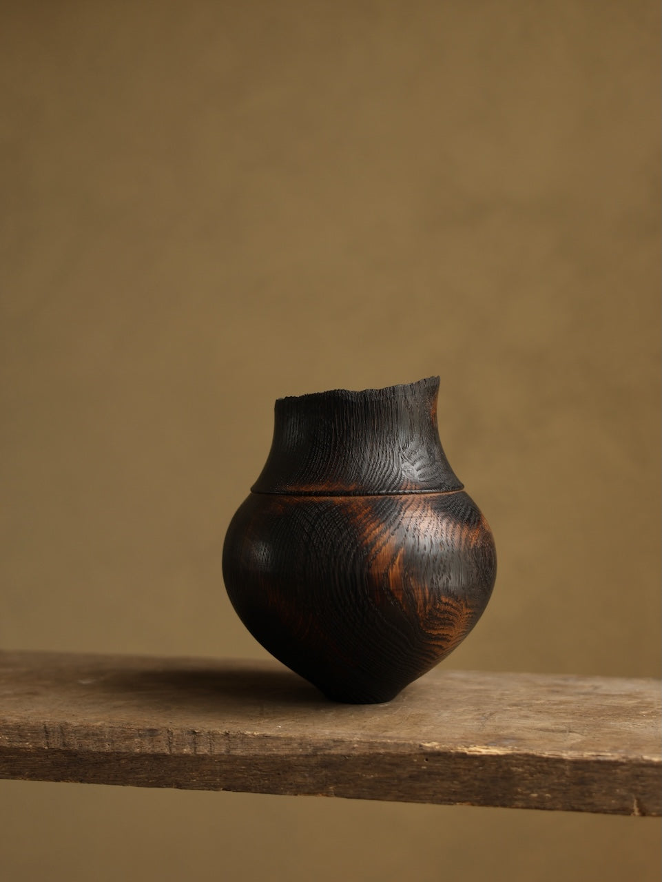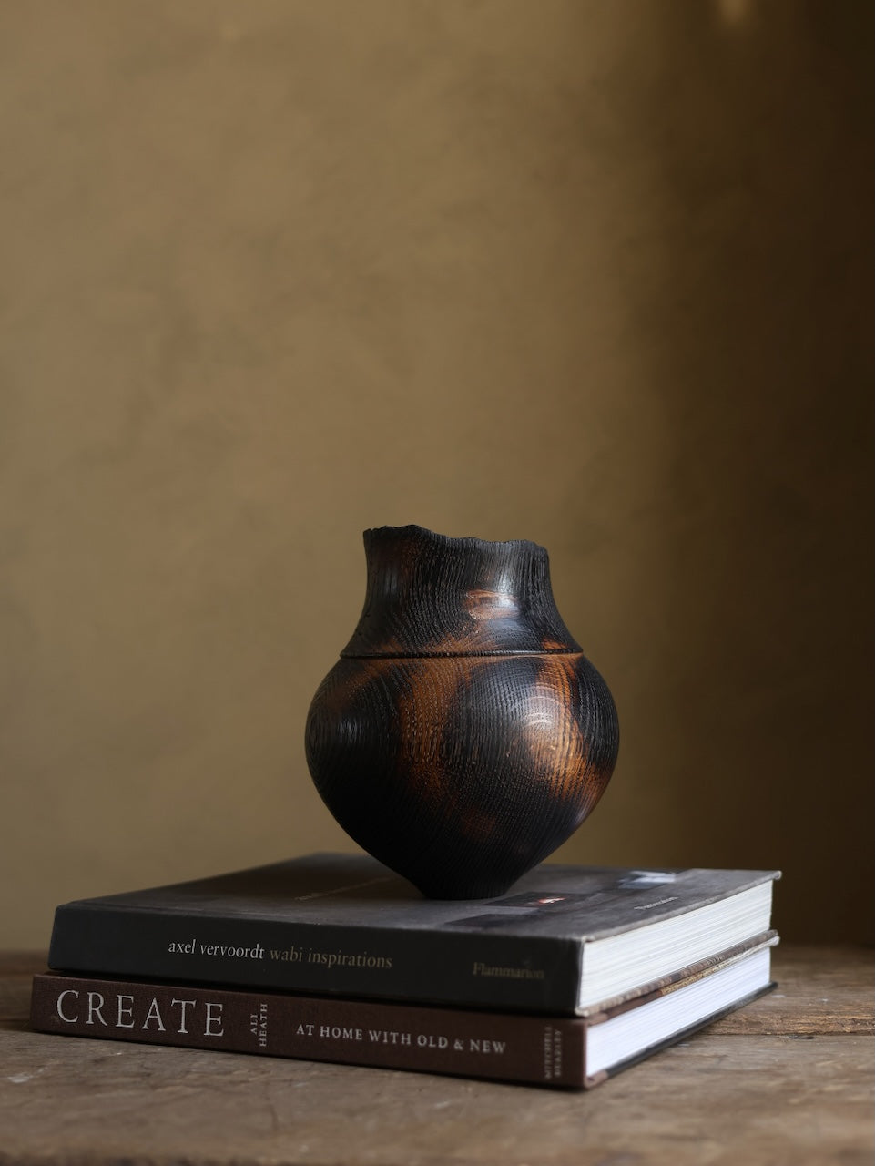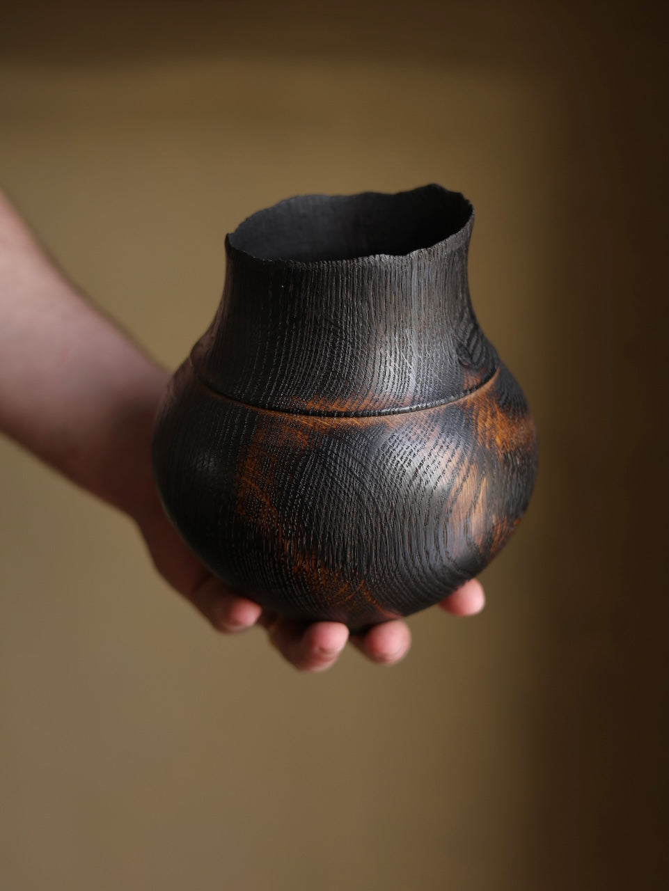 Amphora in our Smoke finished Oak that has been selectively charred and eroded by fire before brushing back to reveal the intricate texture of the grain. The piece is then subtly polished before rinsing in a lime solution and being washed. It is then coated in a UV protective Danish Oil and buffed with Renaissance wax before a thorough burnishing with a very stiff brush to create a rich textured surface.