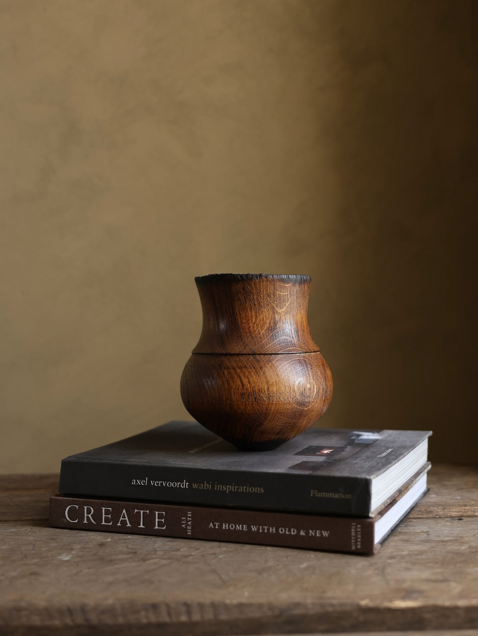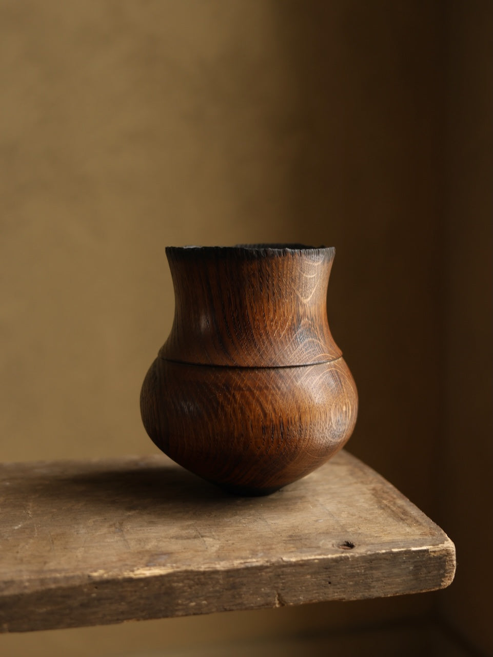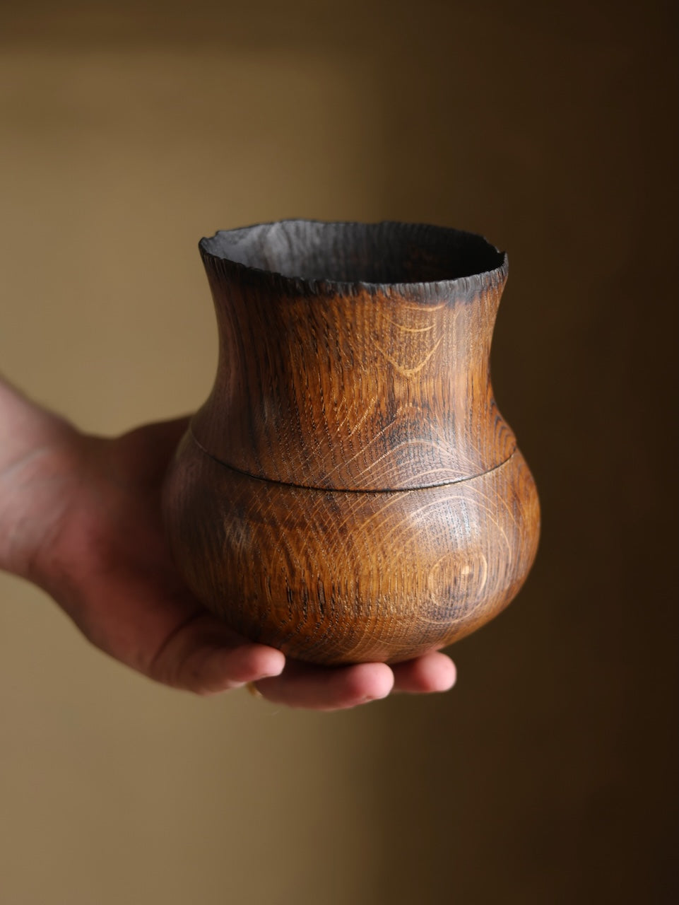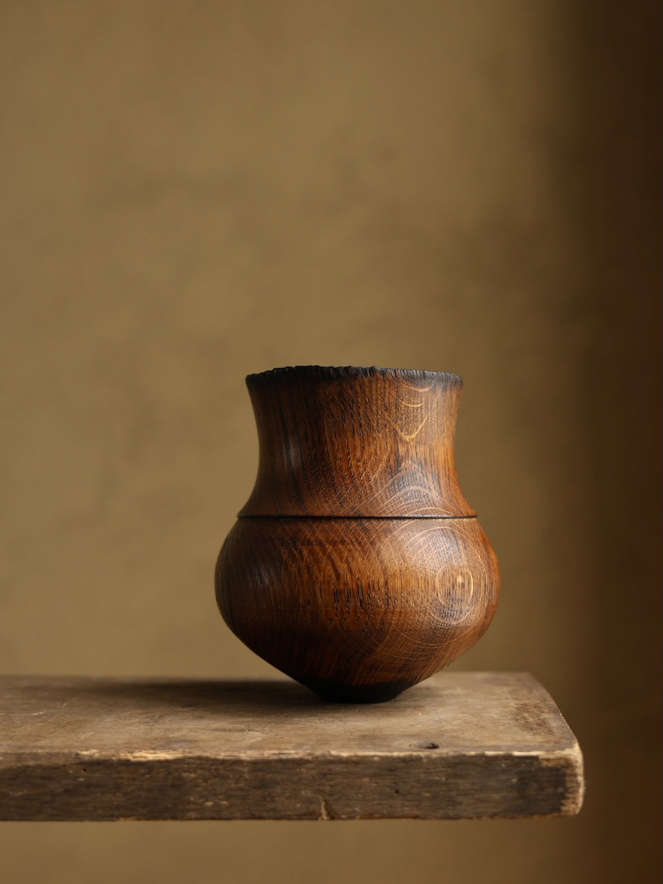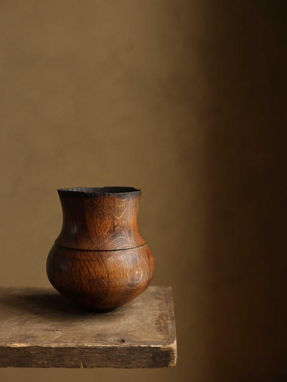 Amphora in our very lightly charred limed finish that has a rim subtly eroded by fire and a surface lightly touched by the flame. The piece is then subtly polished before rinsing in a lime solution and being washed. It is then coated in a UV protective Danish Oil and buffed with Renaissance wax before a thorough burnishing with a very stiff brush to create a rich textured surface.