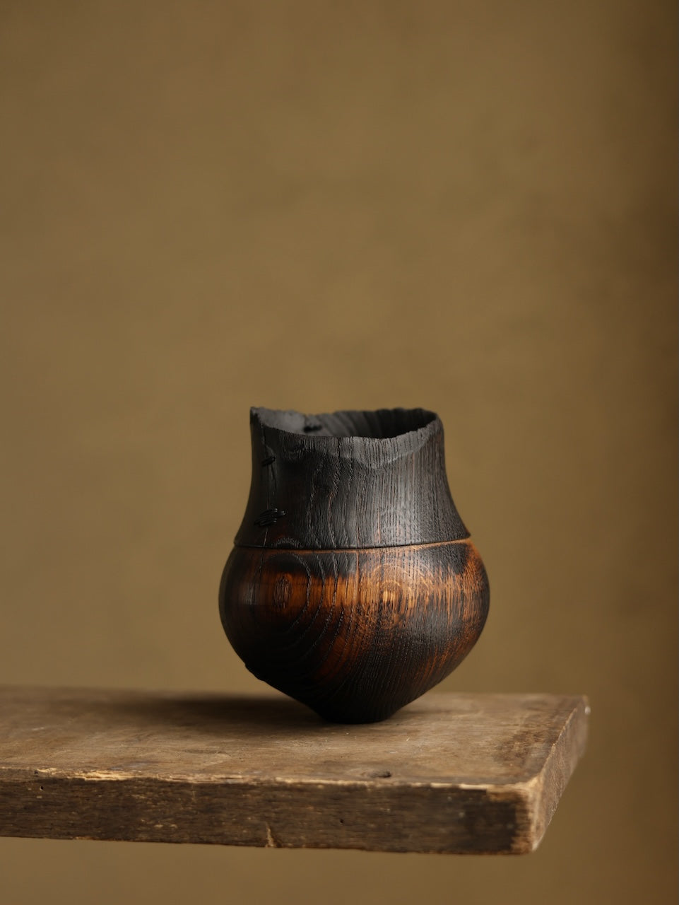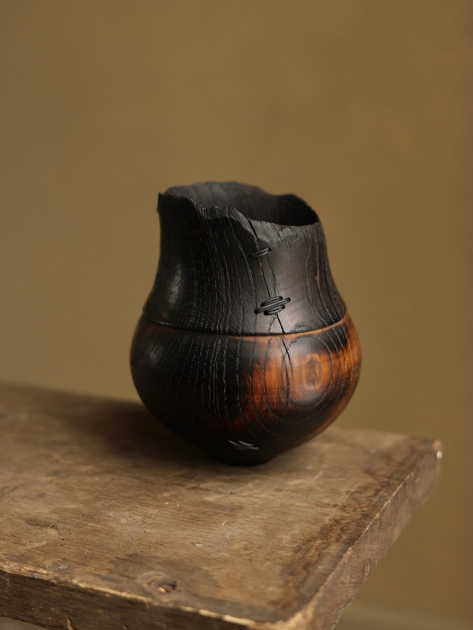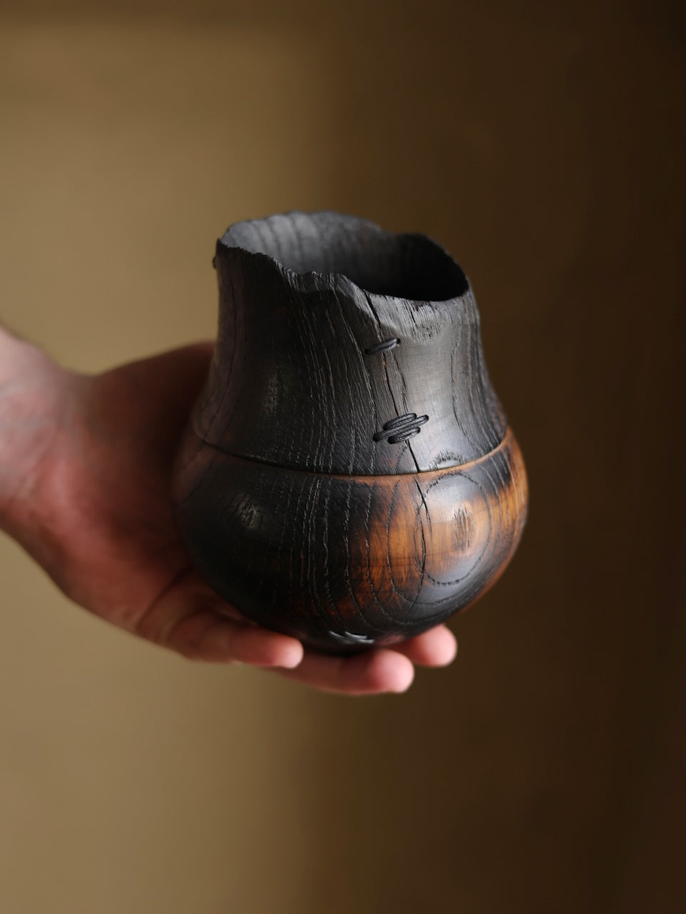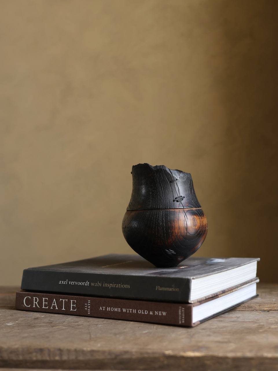 Amphora in our Smoke finished Oak that has been selectively charred and eroded by fire before brushing back to reveal the intricate texture of the grain. The piece is then subtly polished before rinsing in a lime solution and being washed. It is then coated in a UV protective Danish Oil and buffed with Renaissance wax before a thorough burnishing with a very stiff brush to create a rich textured surface. Finally any natural fissures and imperfections are celebrated through mending with waxed cotton stitch-work.