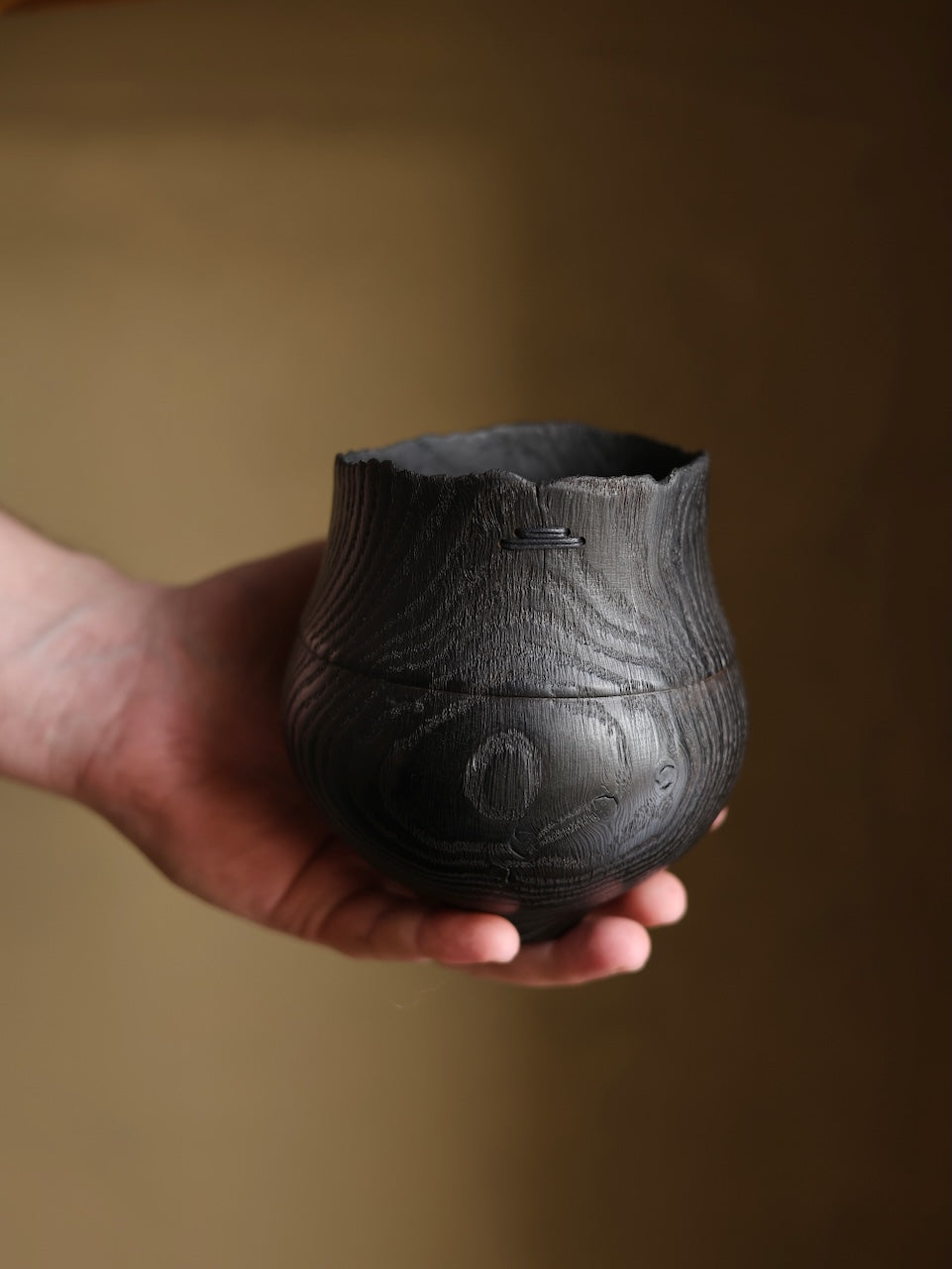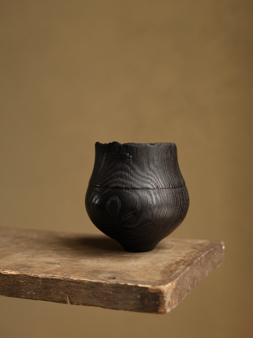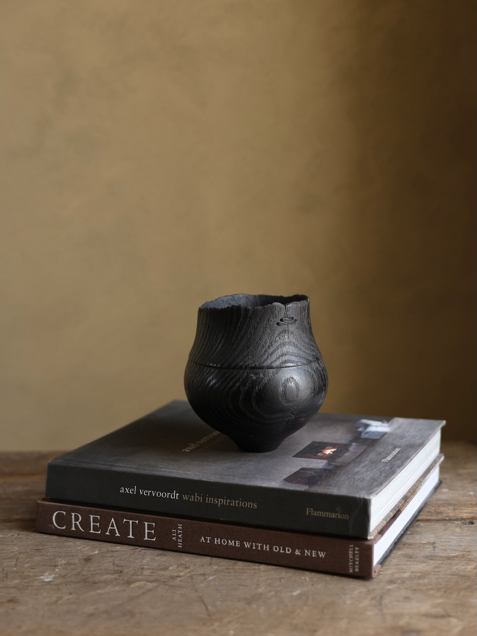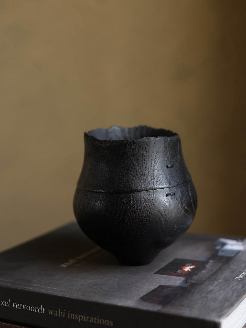 Amphora in blackened Oak that has been heavily charred and eroded by fire then brushed back to reveal the intricate texture of the grain. The piece is then washed and subtly polished before coating in a UV protective Danish Oil and buffed with Renaissance wax and a thorough burnishing with a stiff brush to create a rich textured surface. Finally any natural fissures and imperfections are celebrated through mending with waxed cotton stitch-work.