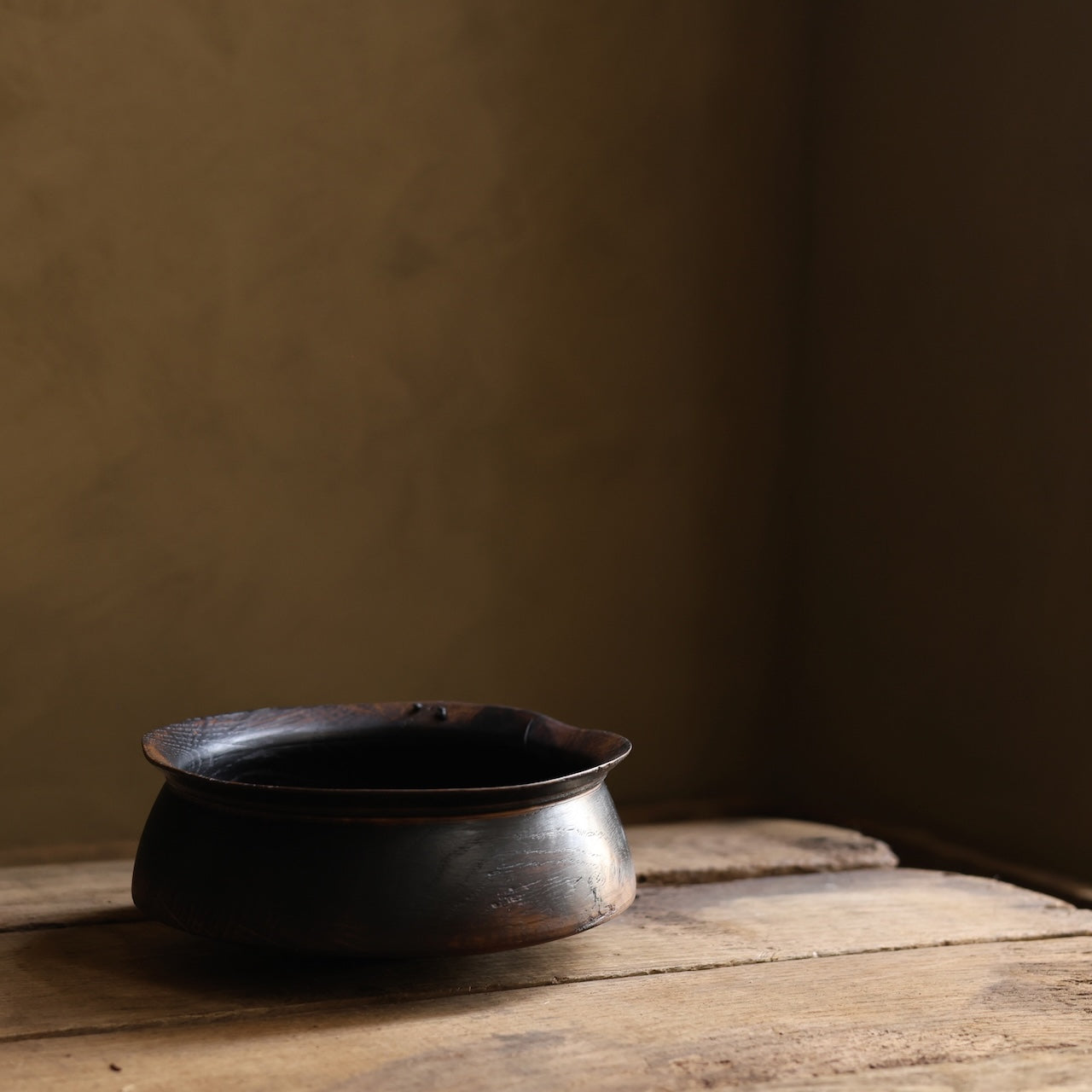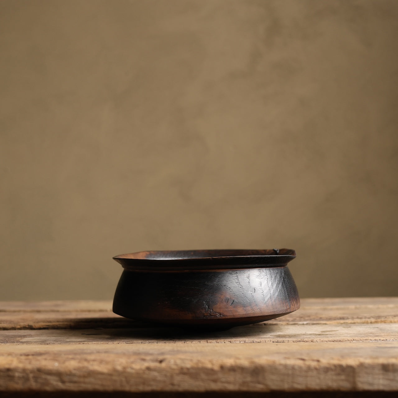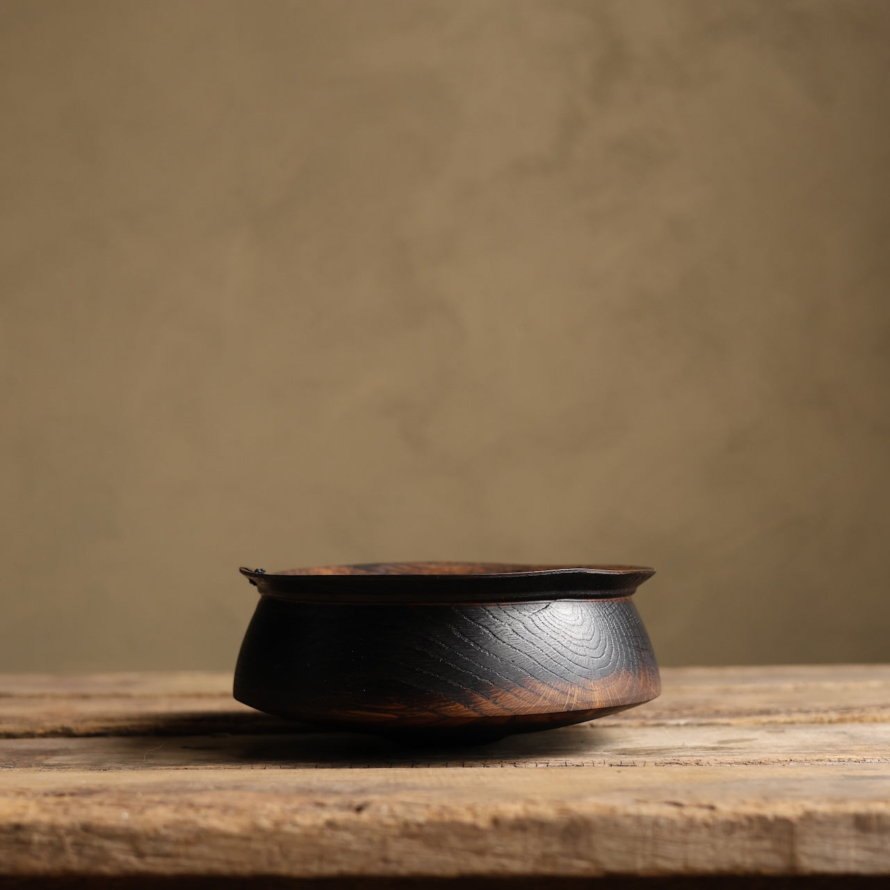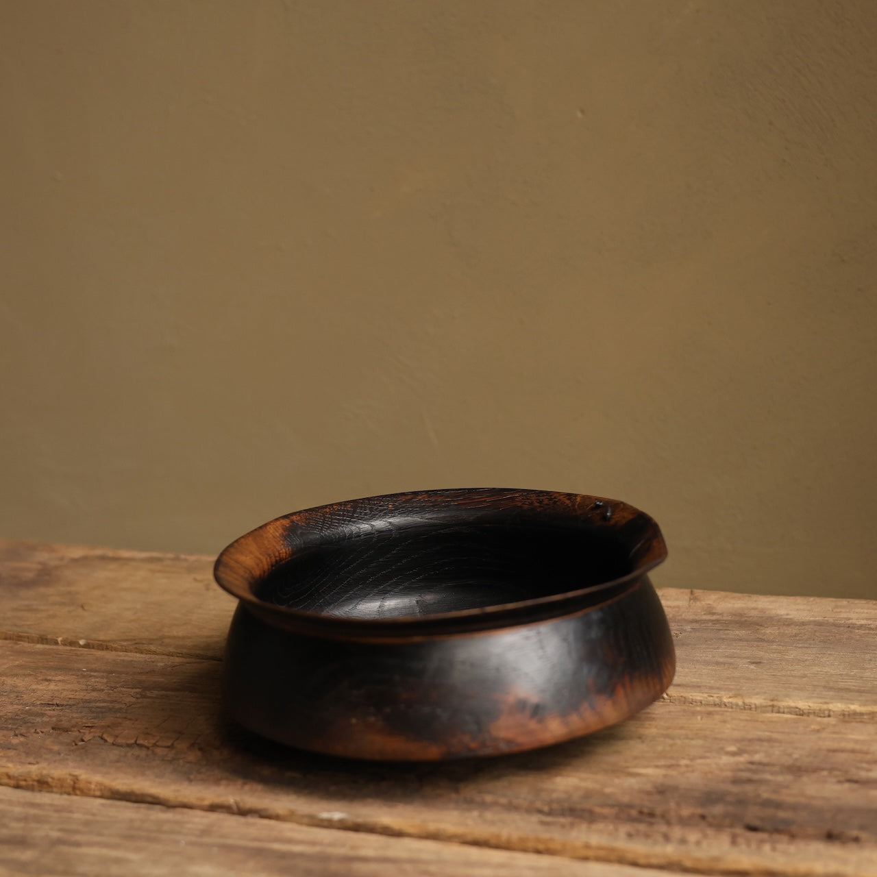 Patinated Oak vessel treated with lime and a touch of fire before coating with danish oil and wax and then repaired with our signature waxed cotton stitchwork.