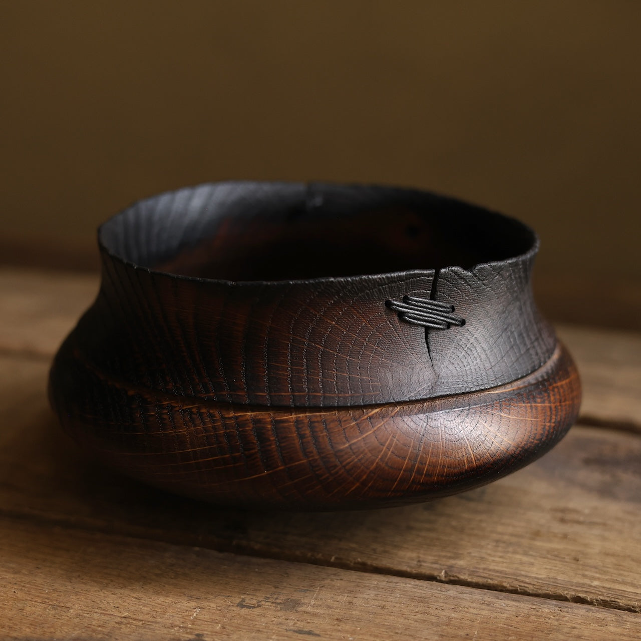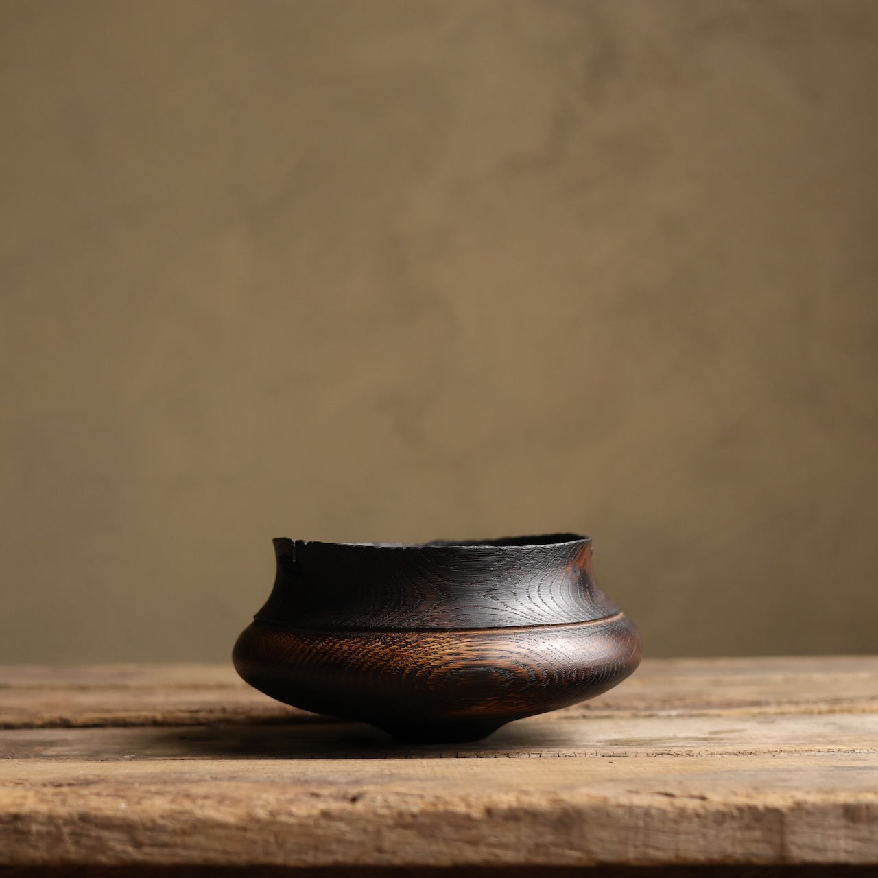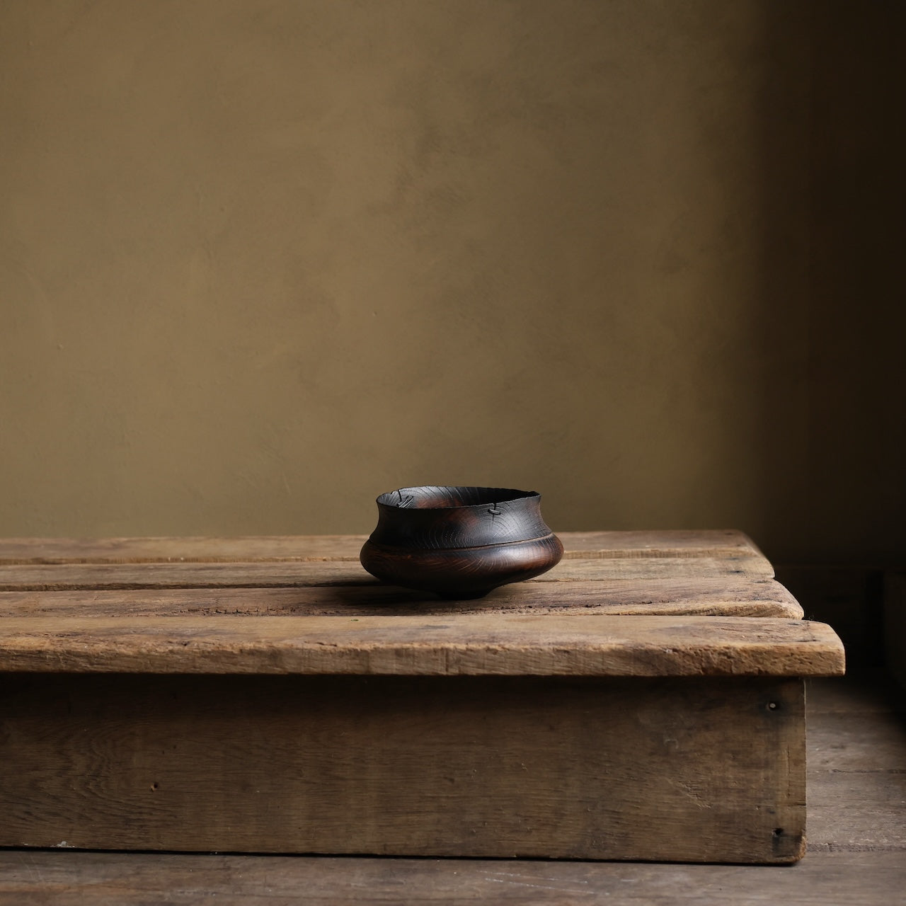 Patinated Oak vessel treated with lime and a touch of fire before coating with danish oil and wax and burnishing with a stiff brush. Finally the piece is mended with our signature stitchwork repair.