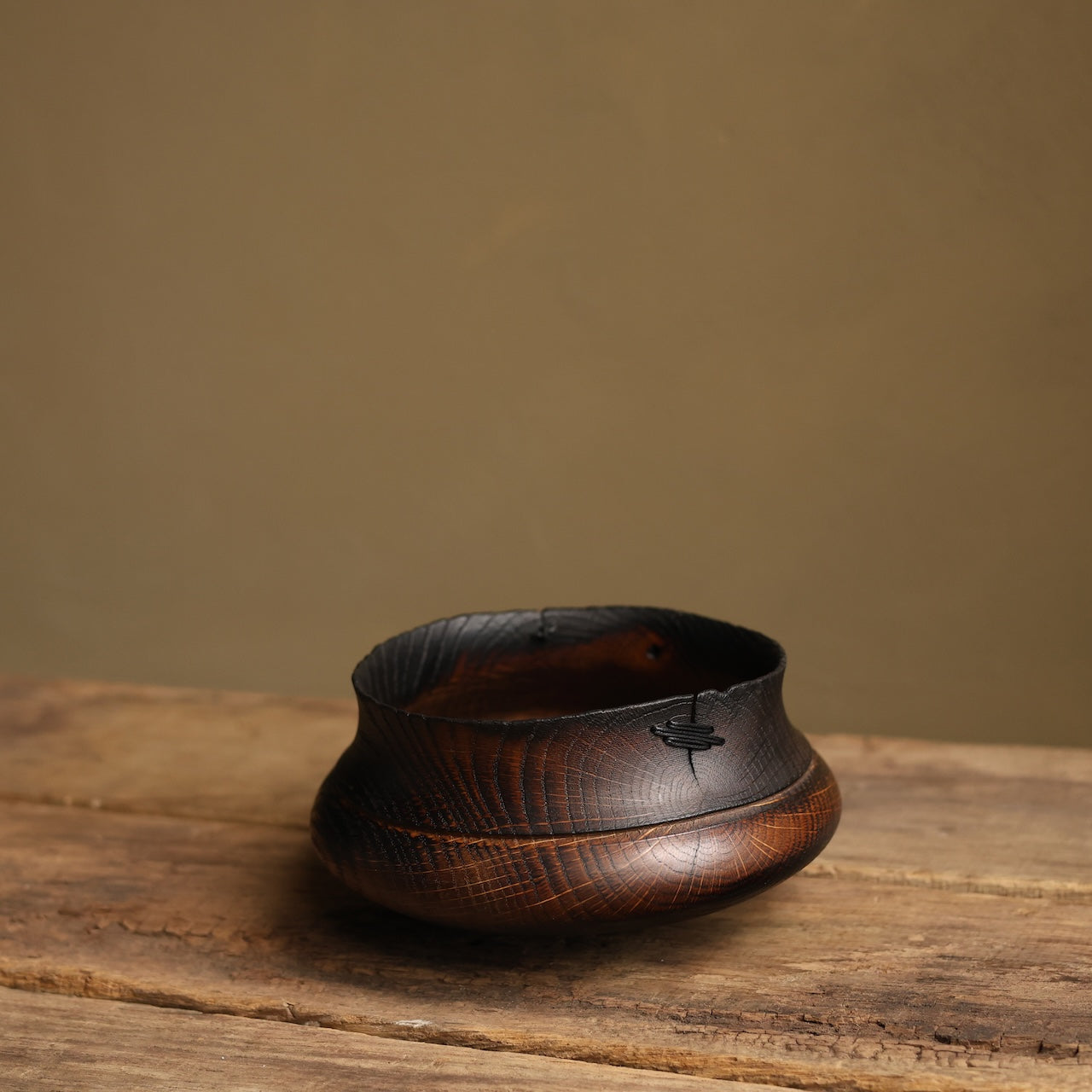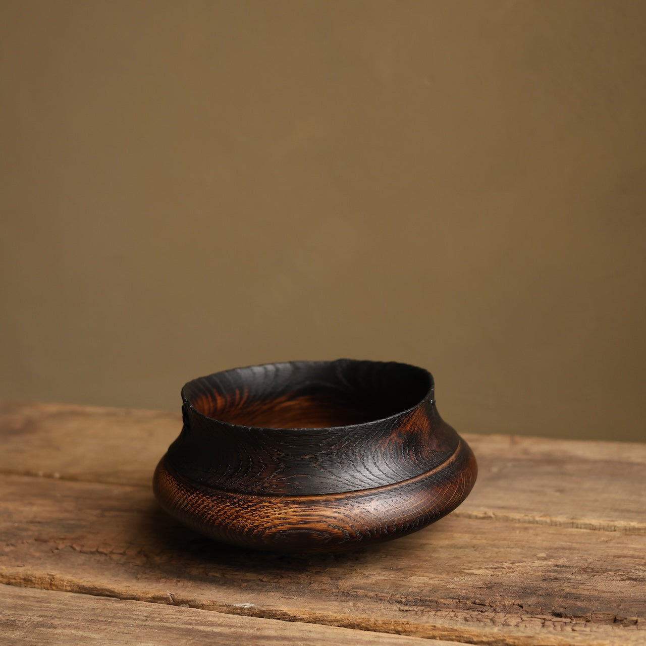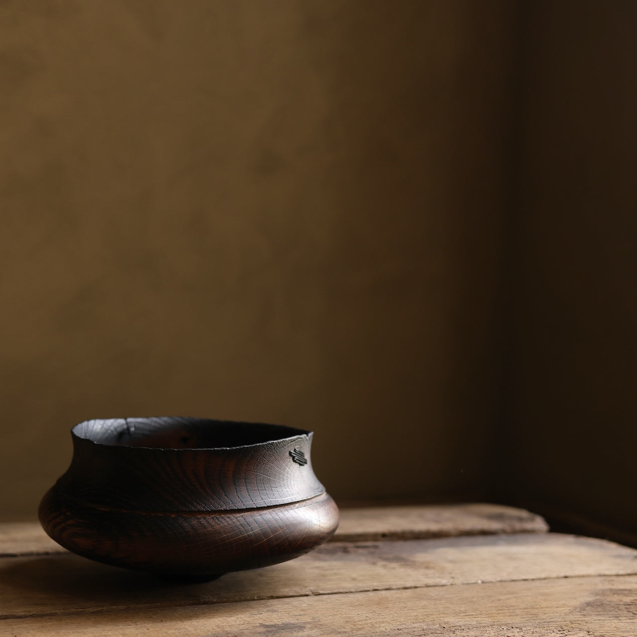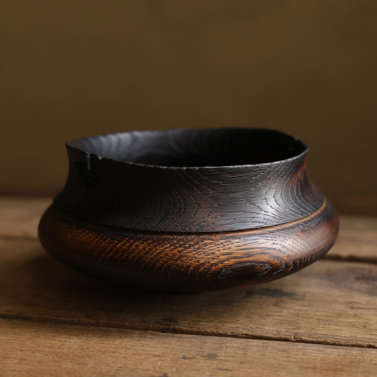 Patinated Oak vessel treated with lime and a touch of fire before coating with danish oil and wax and burnishing with a stiff brush. Finally the piece is mended with our signature stitchwork repair.