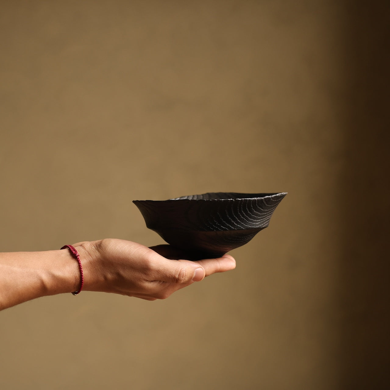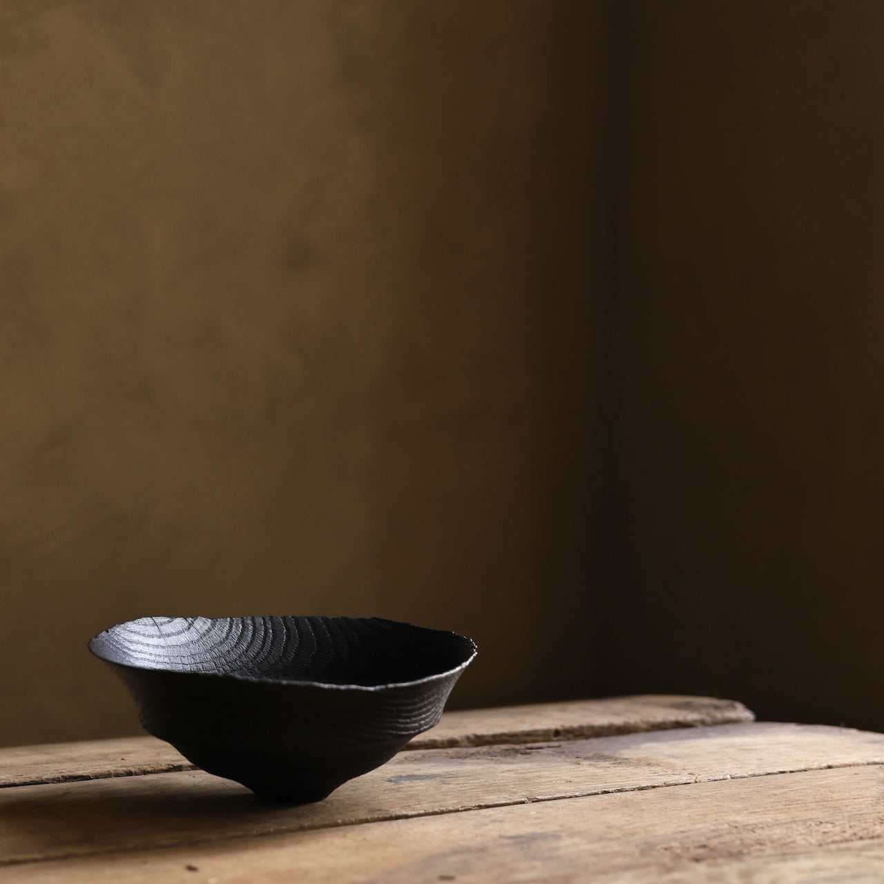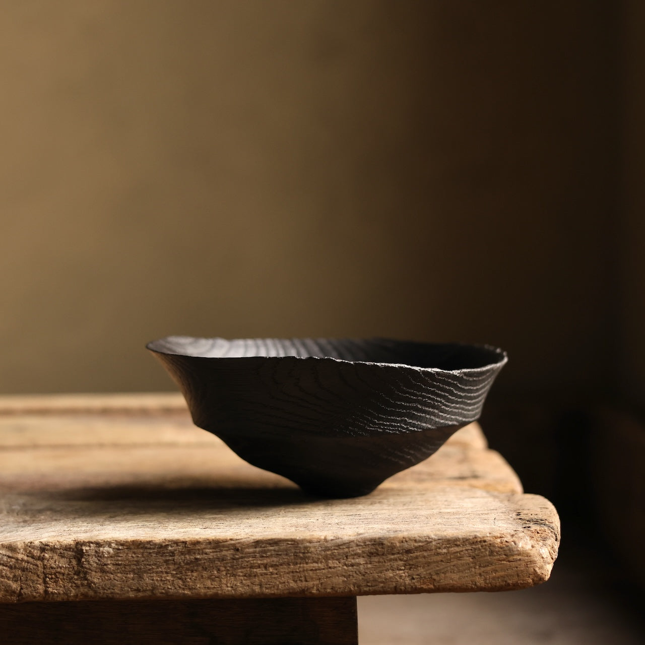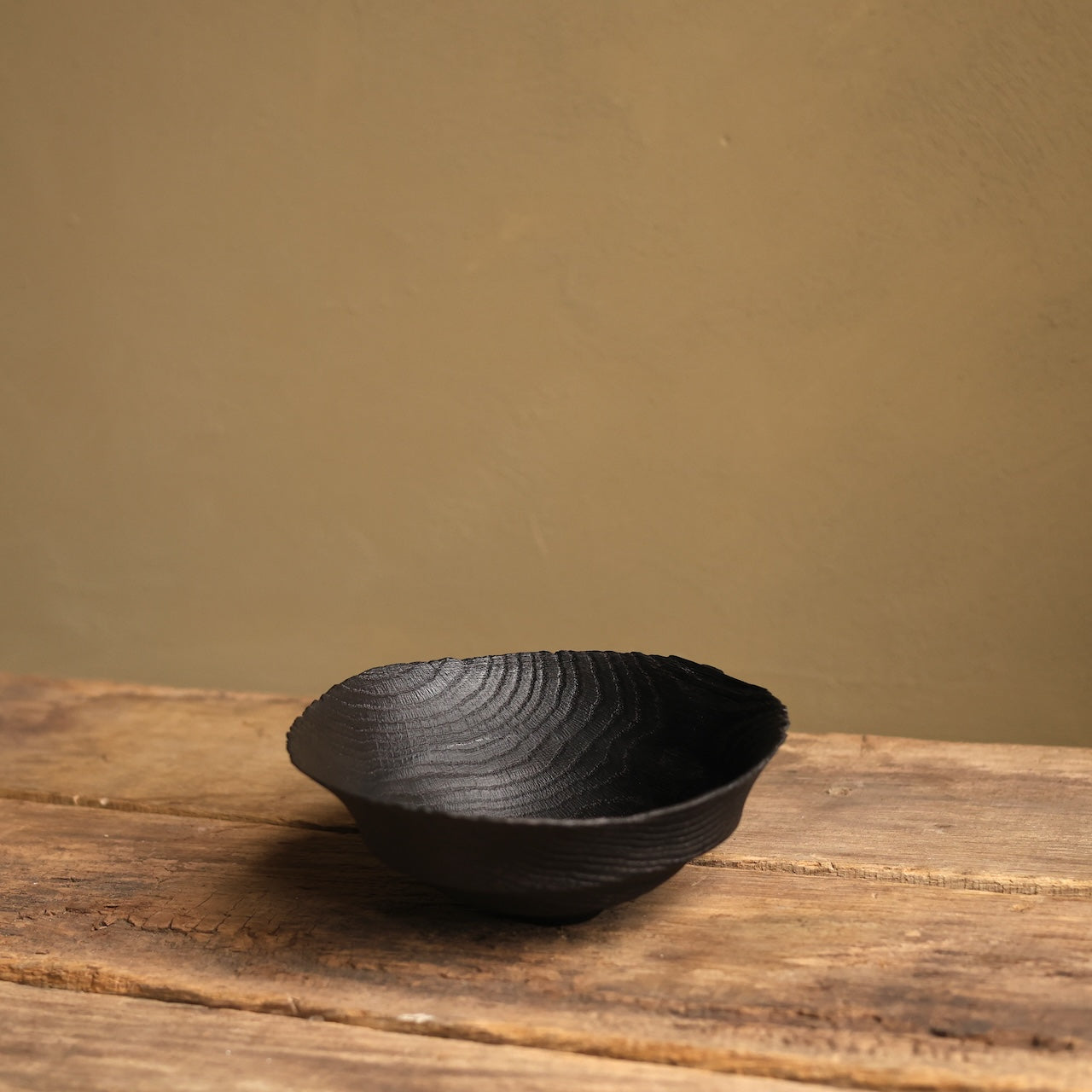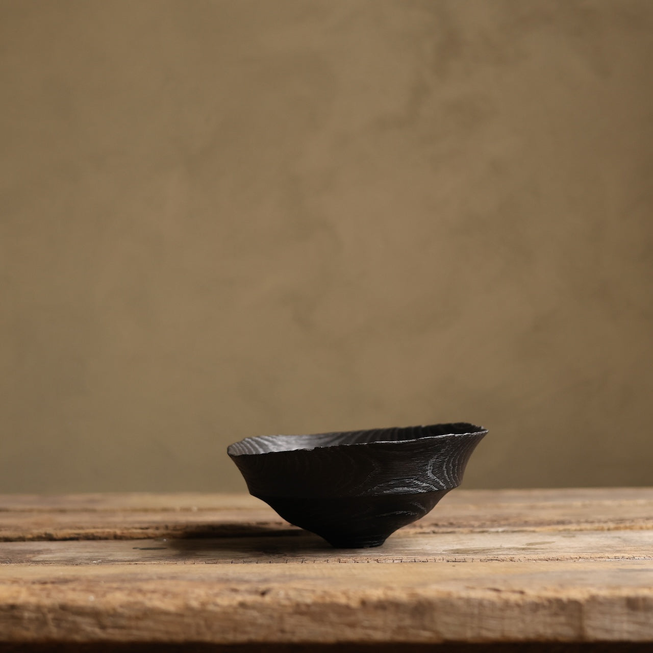 Deeply charred oak vessel that was brushed back to reveal the texture of the grain before coating with danish oil and wax and then burnishing with a stiff brush.