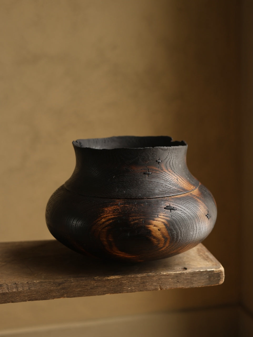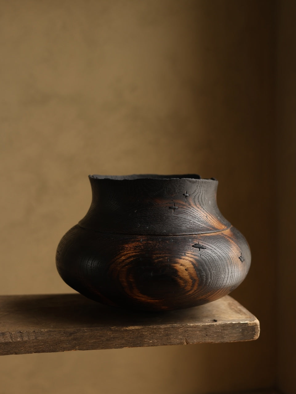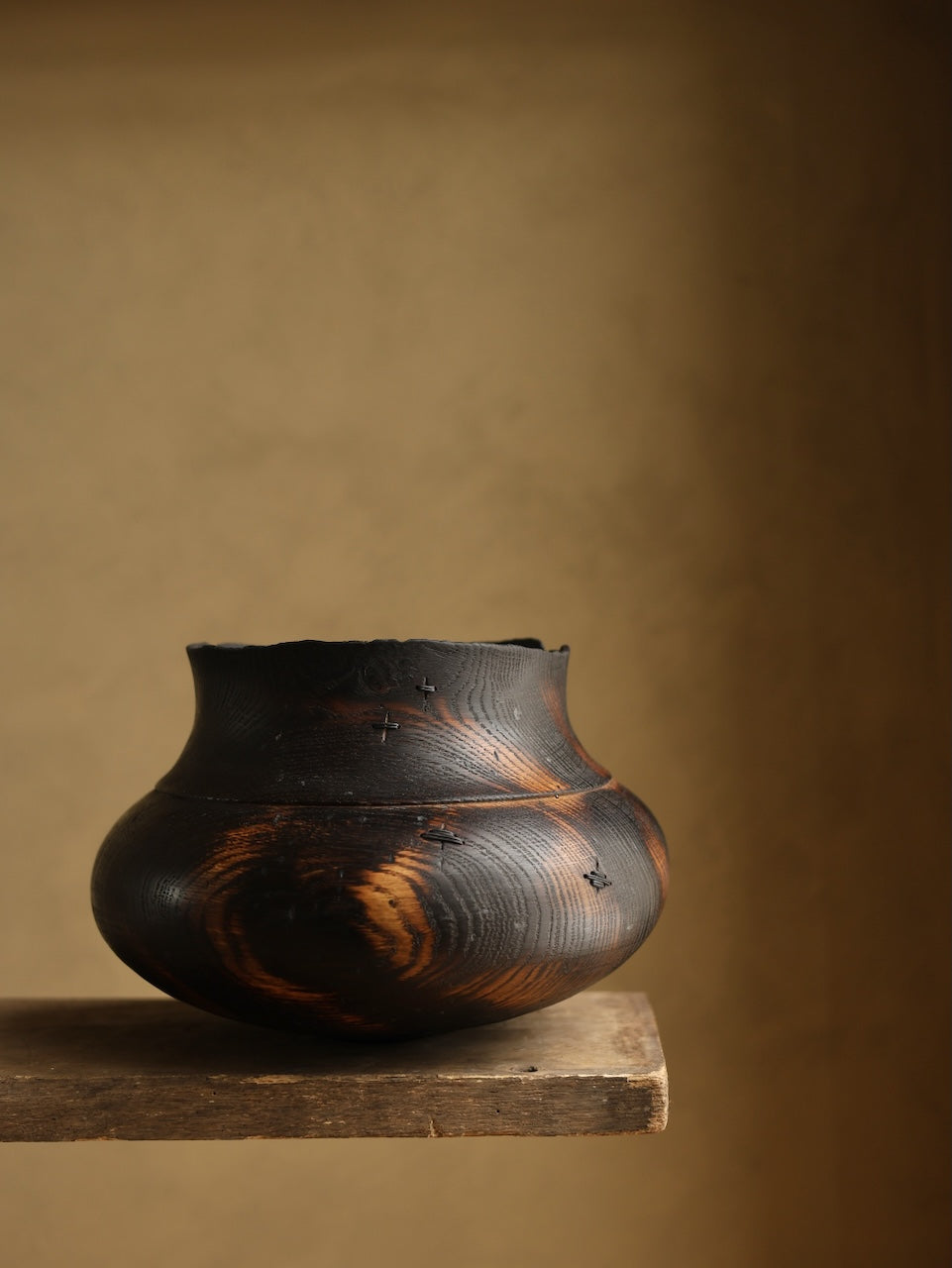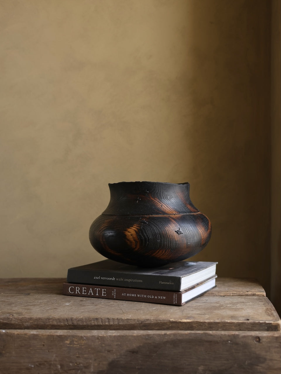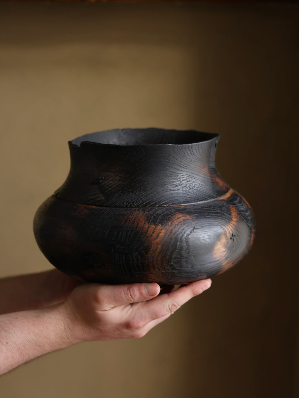 Amphora in our Smoke finished Oak that has been selectively charred and eroded by fire before brushing back to reveal the intricate texture of the grain. The piece is then subtly polished before rinsing in a lime solution and being washed. It is then coated in a UV protective Danish Oil and buffed with Renaissance wax before a thorough burnishing with a very stiff brush to create a rich textured surface. Finally any natural fissures and imperfections are celebrated through mending with waxed cotton stitch-work.