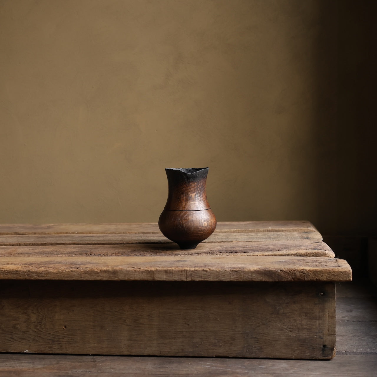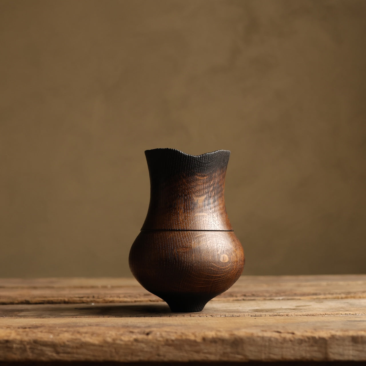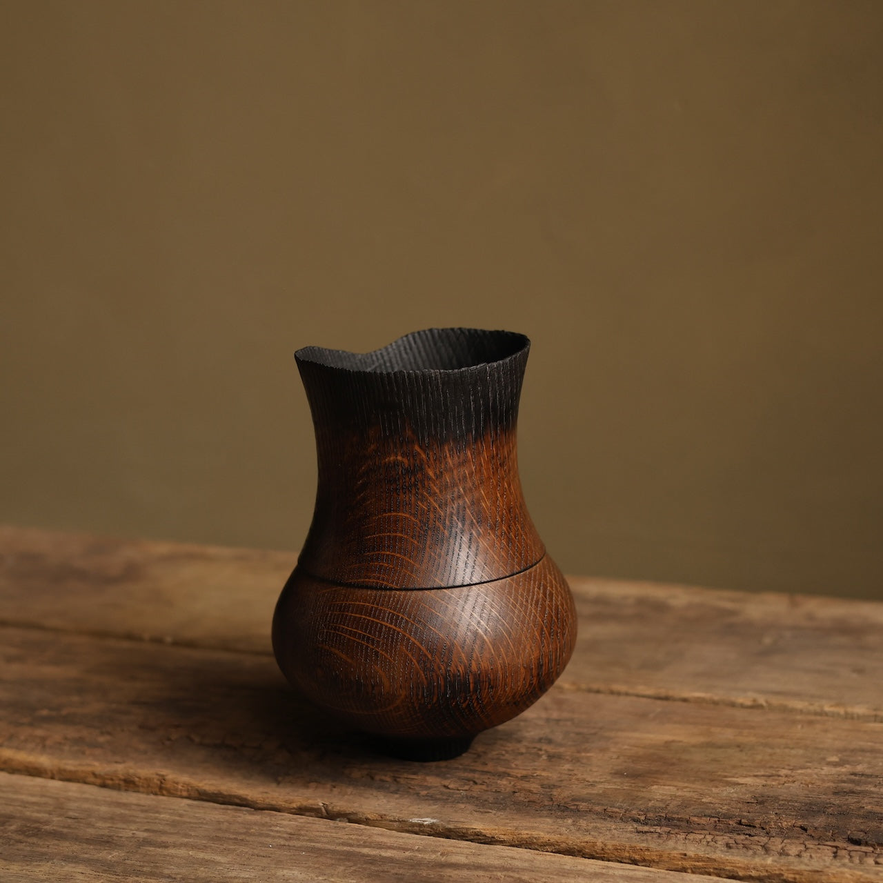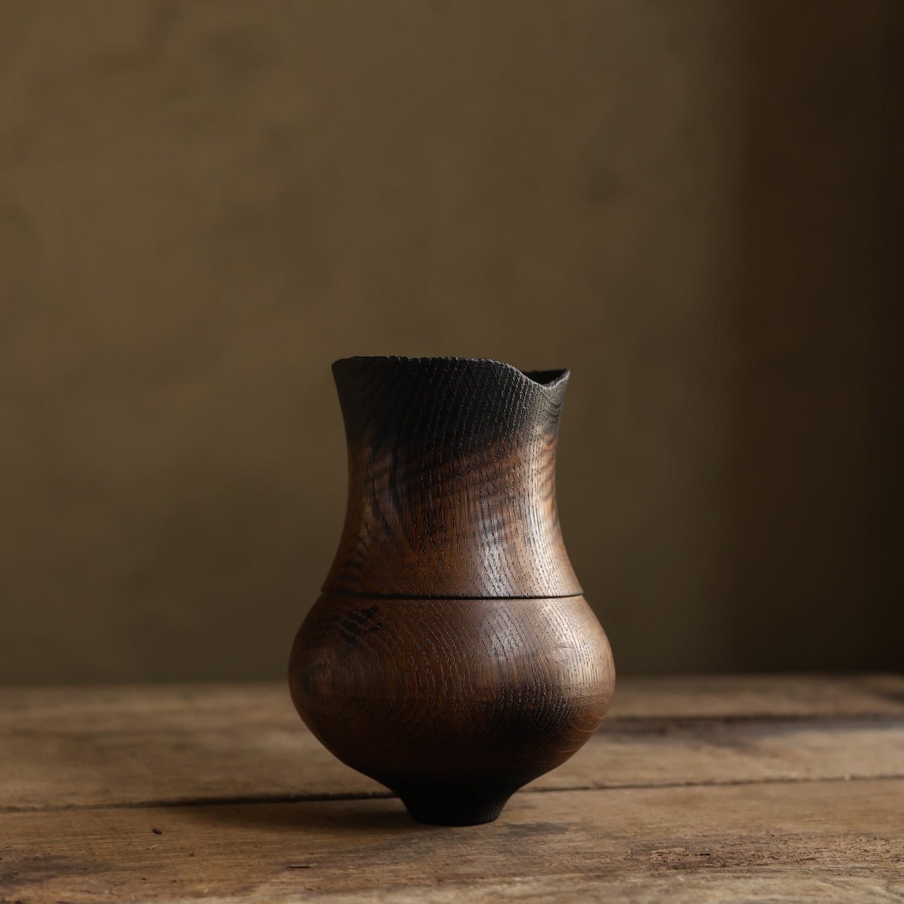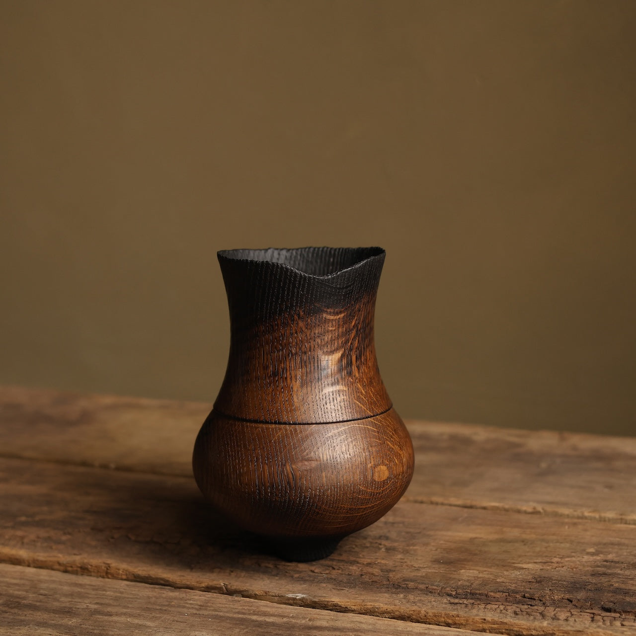 Patinated Oak vessel treated with lime and a touch of fire before coating with danish oil and wax and burnishing with a stiff brush.