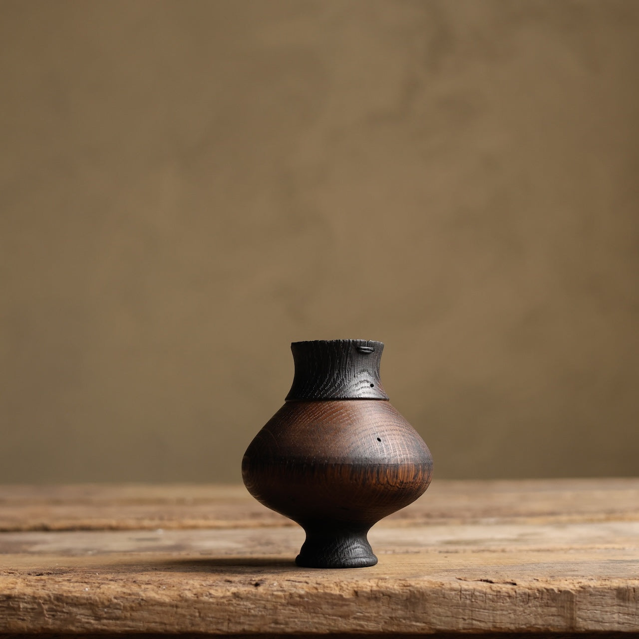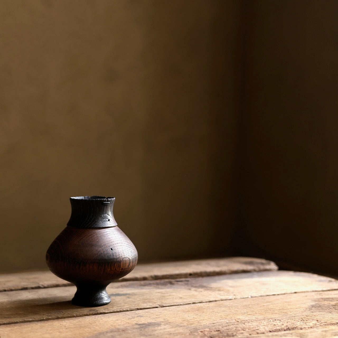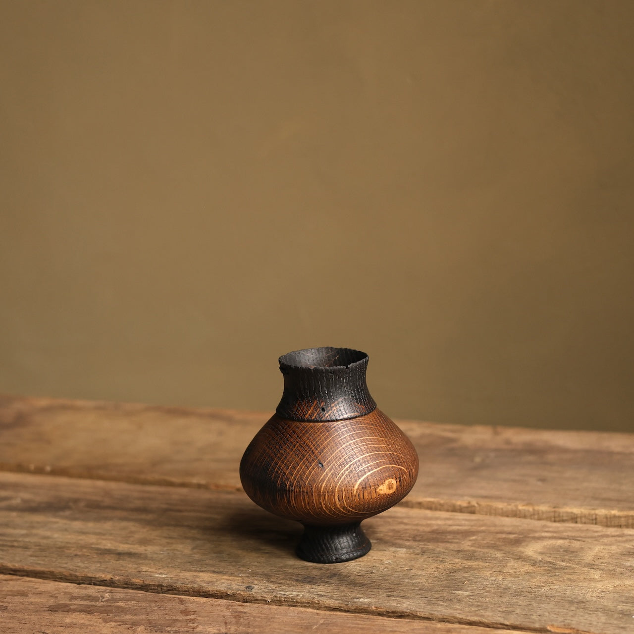 Patinated Oak vessel treated with lime and a touch of fire before coating with danish oil and wax and then repaired with our signature waxed cotton stitchwork.