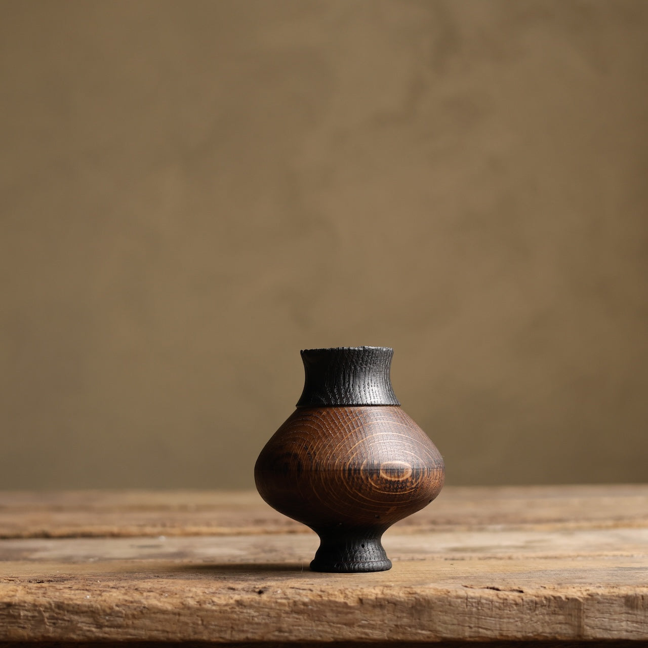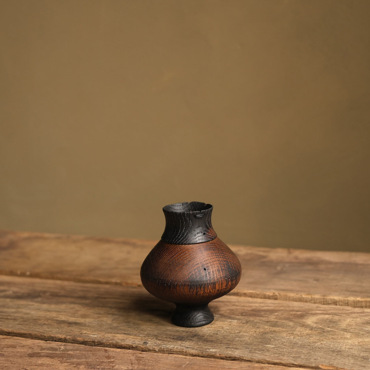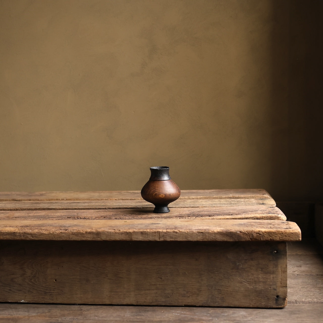 Patinated Oak vessel treated with lime and a touch of fire before coating with danish oil and wax and then repaired with our signature waxed cotton stitchwork.