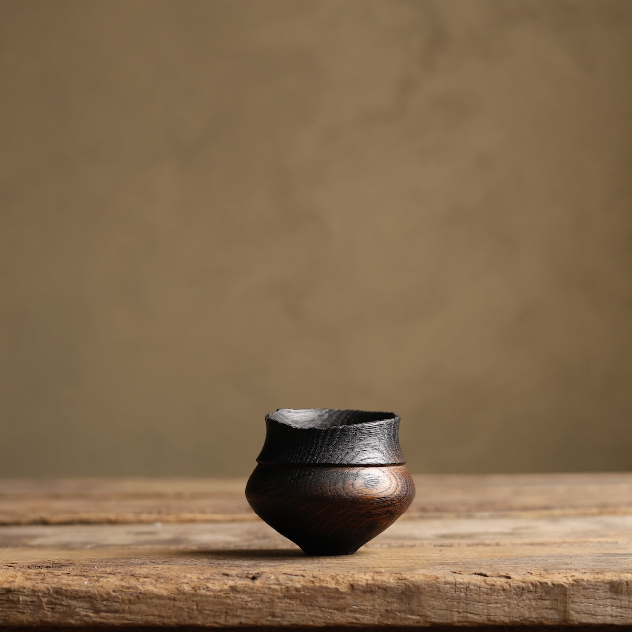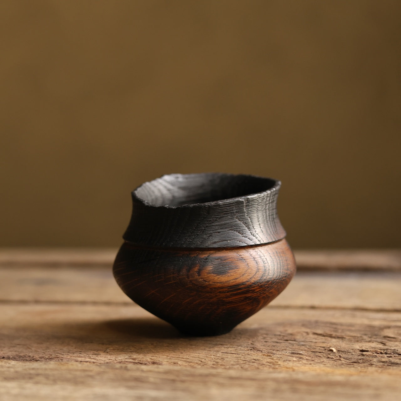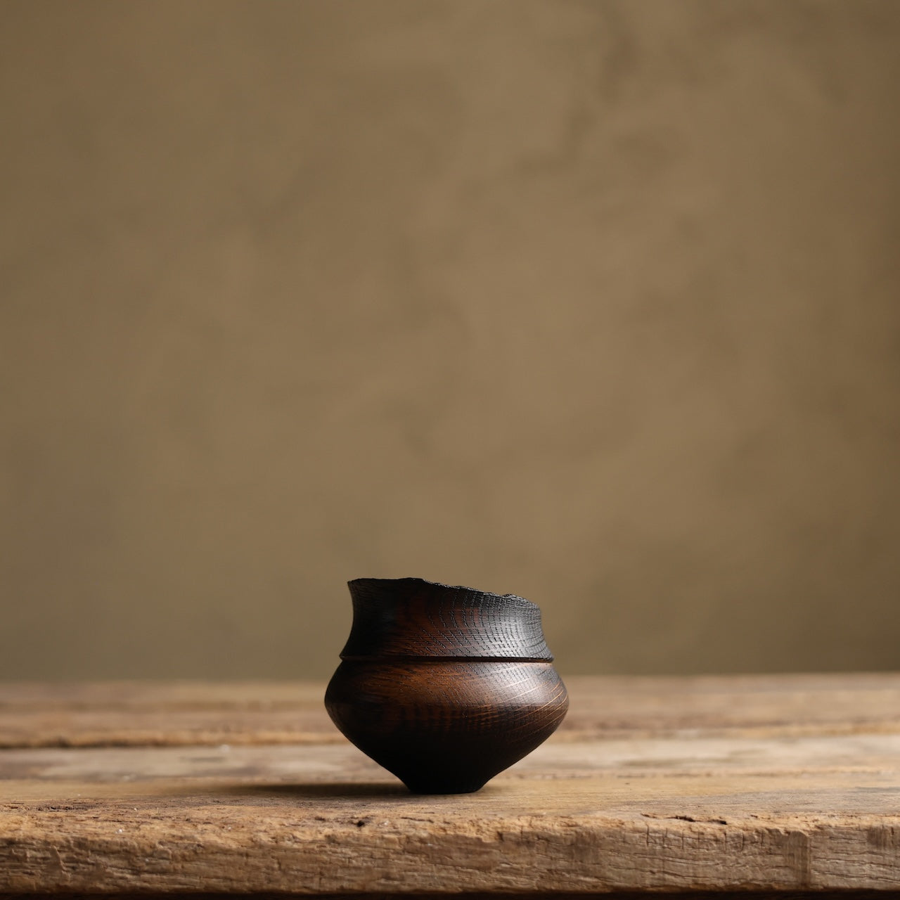 Patinated Oak vessel treated with lime and a touch of fire before coating with danish oil and wax and burnishing with a stiff brush.