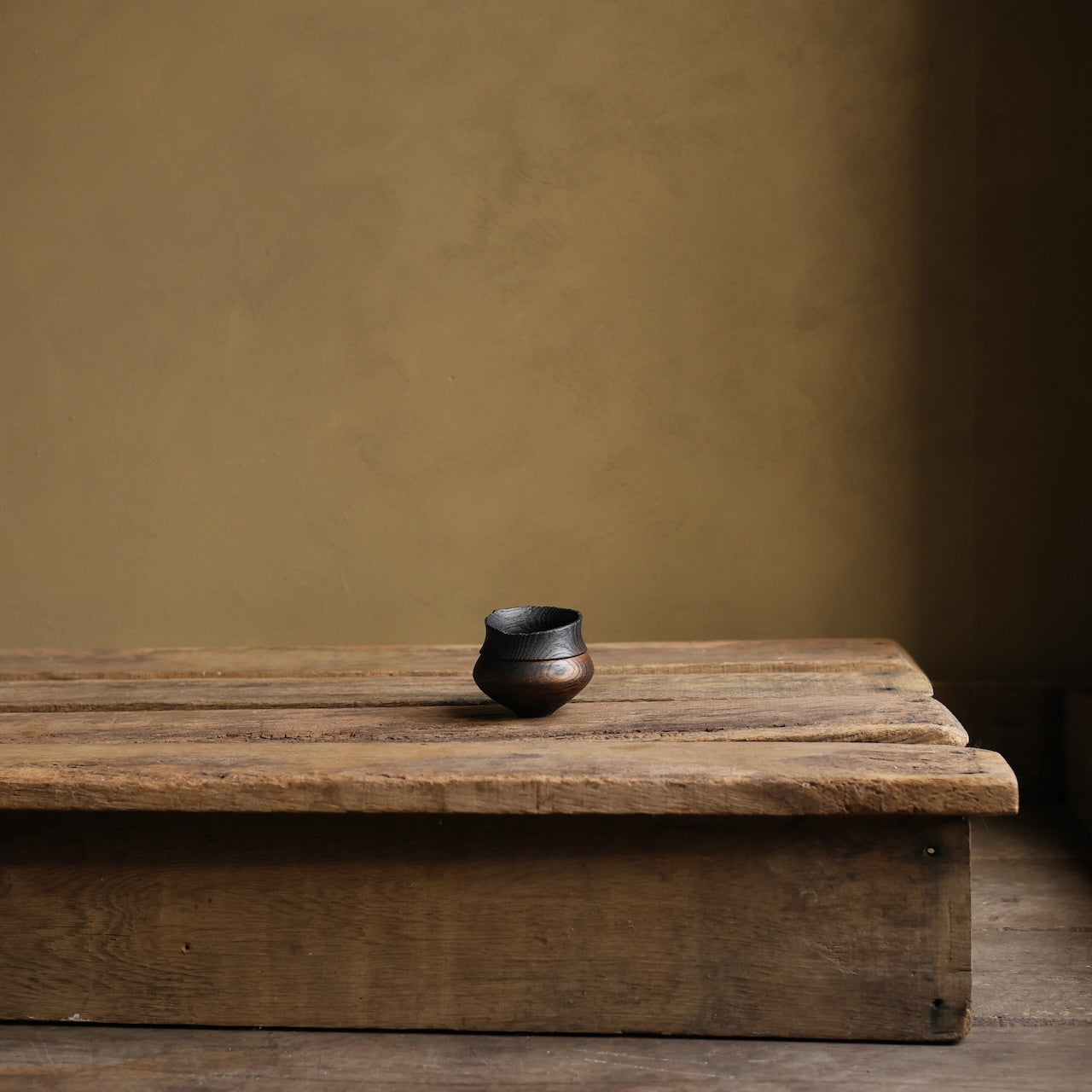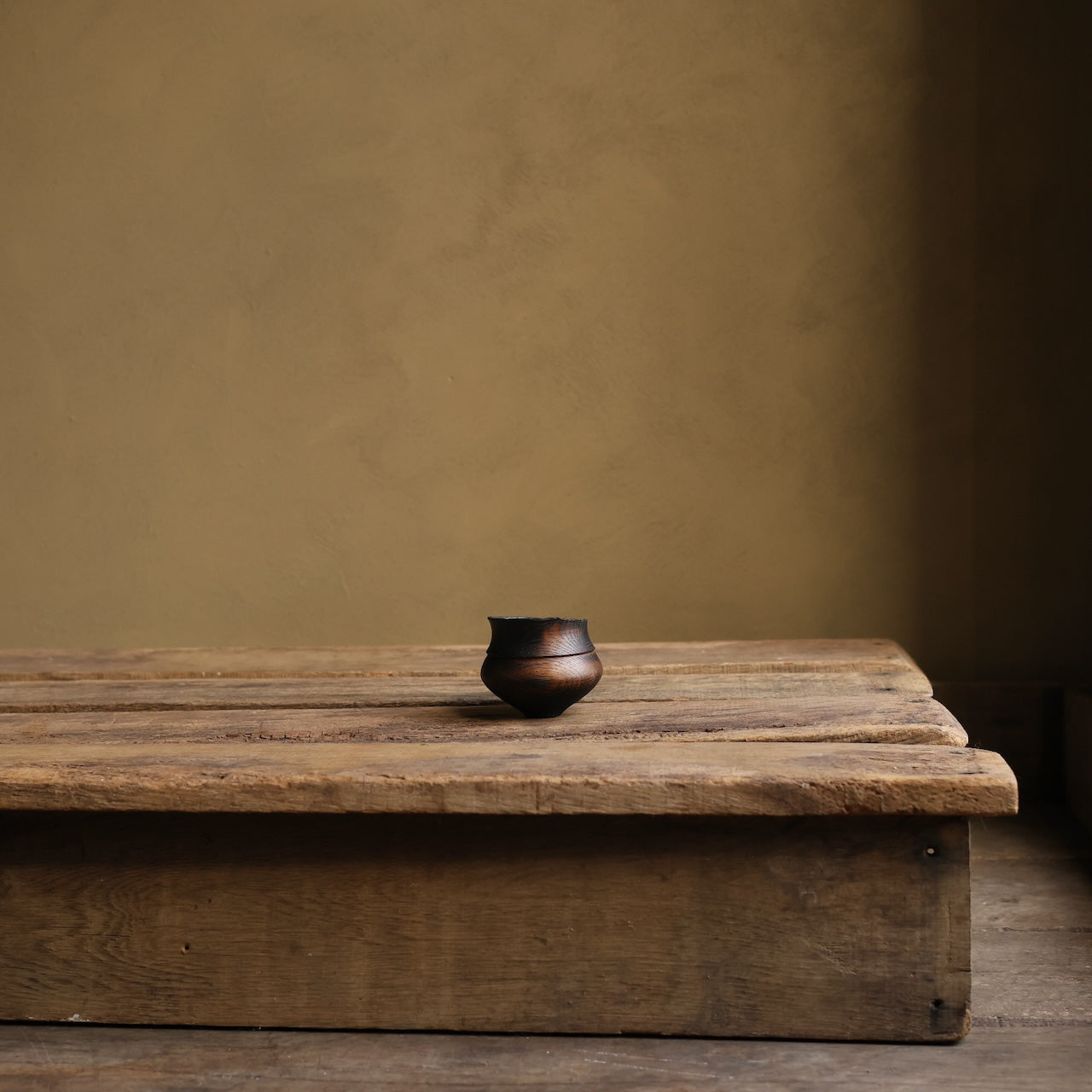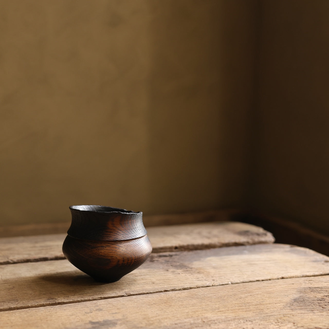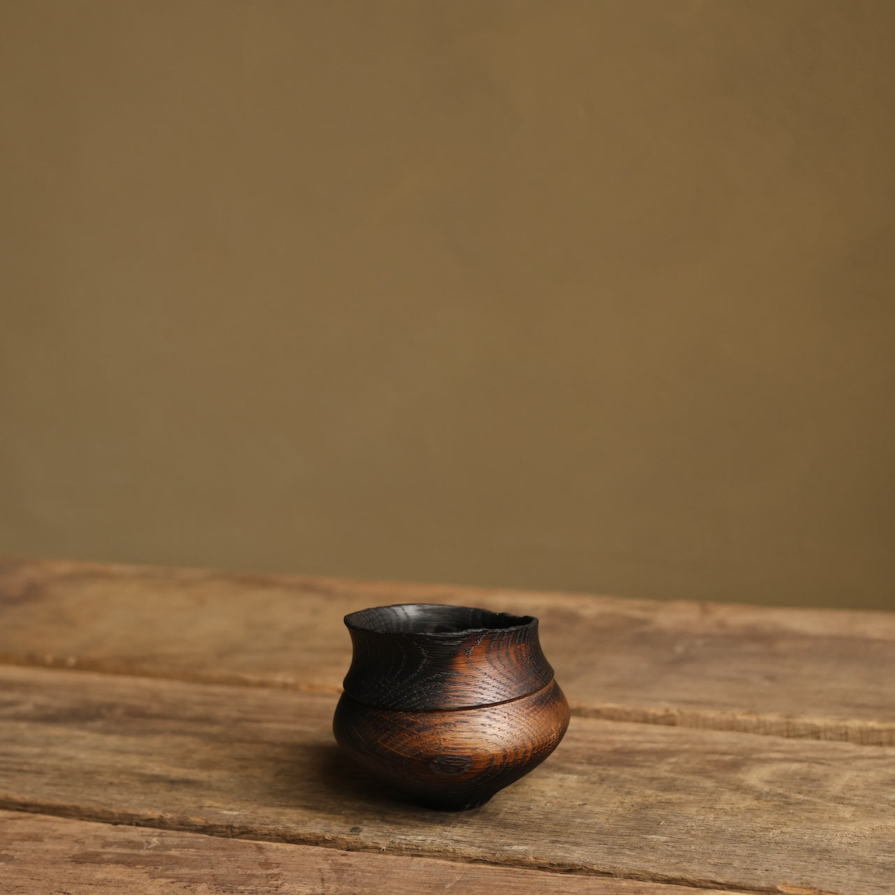 Patinated Oak vessel treated with lime and a touch of fire before coating with danish oil and wax and burnishing with a stiff brush.