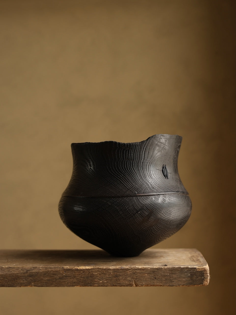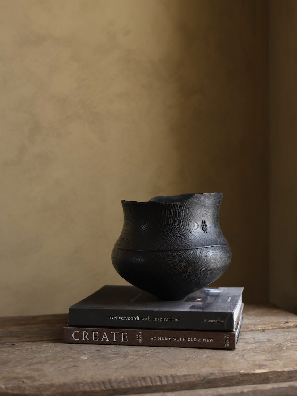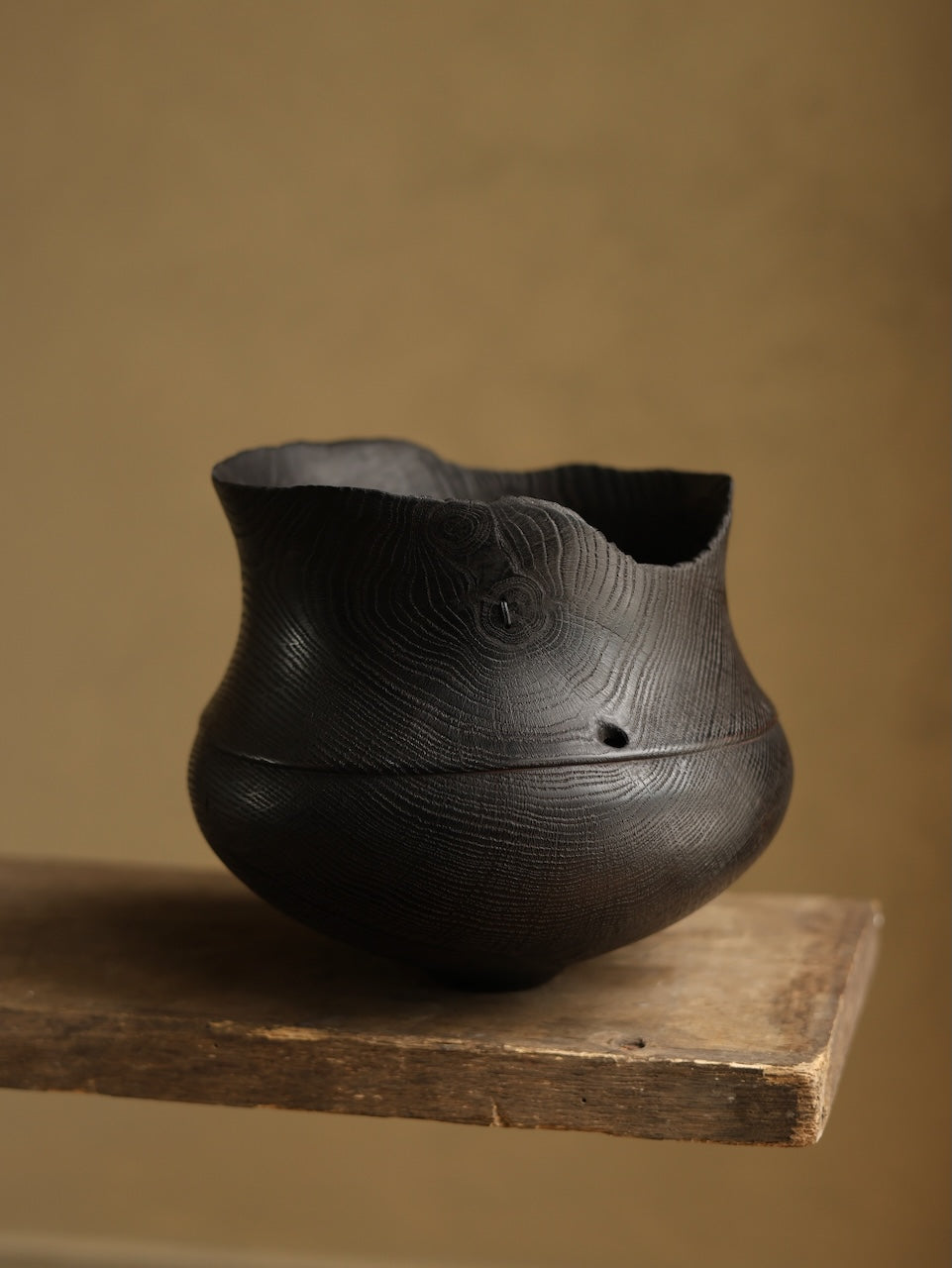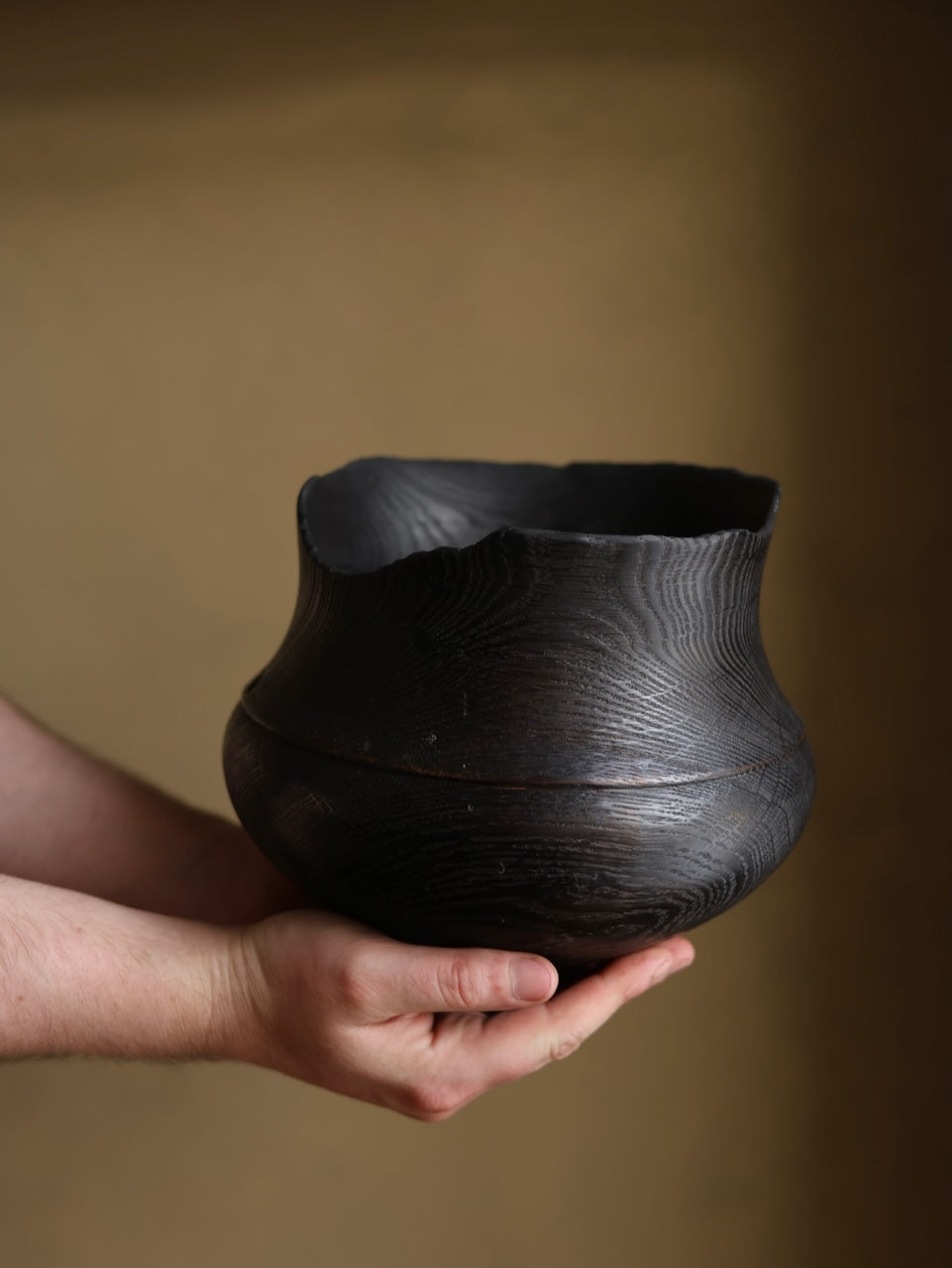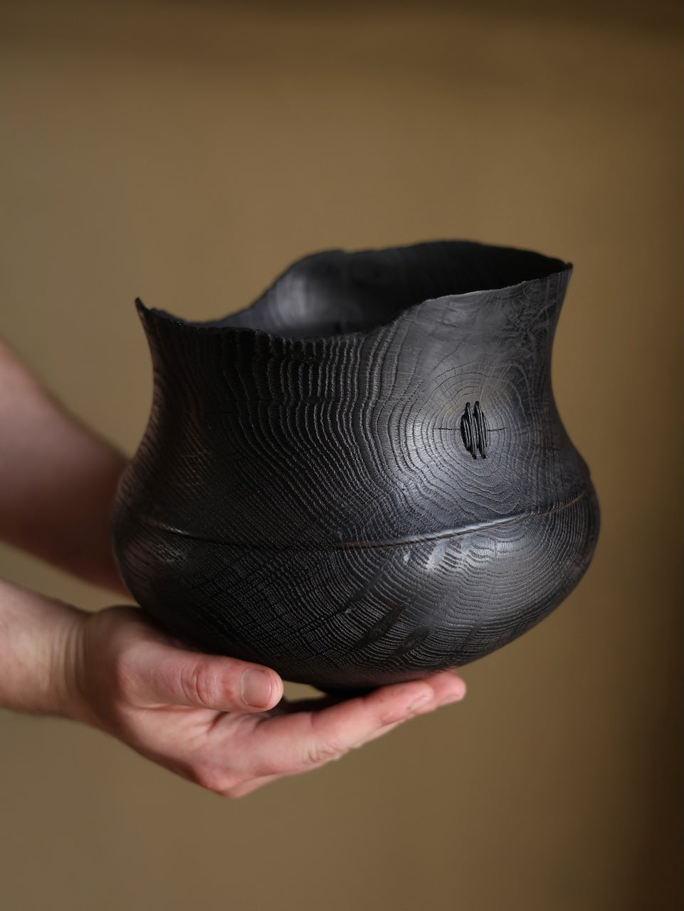 Amphora in blackened Oak that has been heavily charred and eroded by fire then brushed back to reveal the intricate texture of the grain. The piece is then washed and subtly polished before coating in a UV protective Danish Oil and buffed with Renaissance wax and a thorough burnishing with a stiff brush to create a rich textured surface. Finally any natural fissures and imperfections are celebrated through mending with waxed cotton stitch-work.