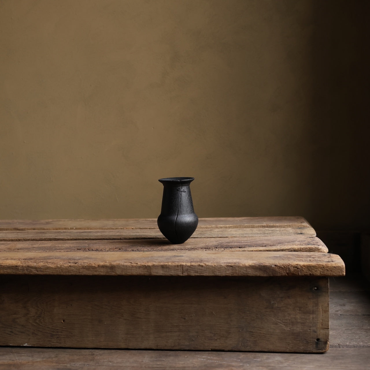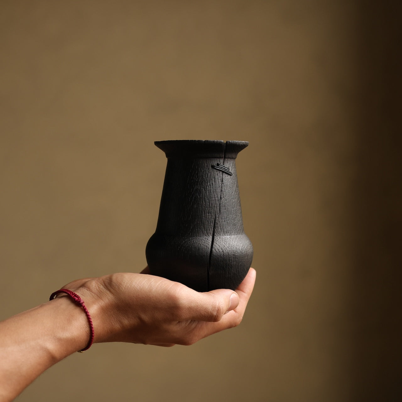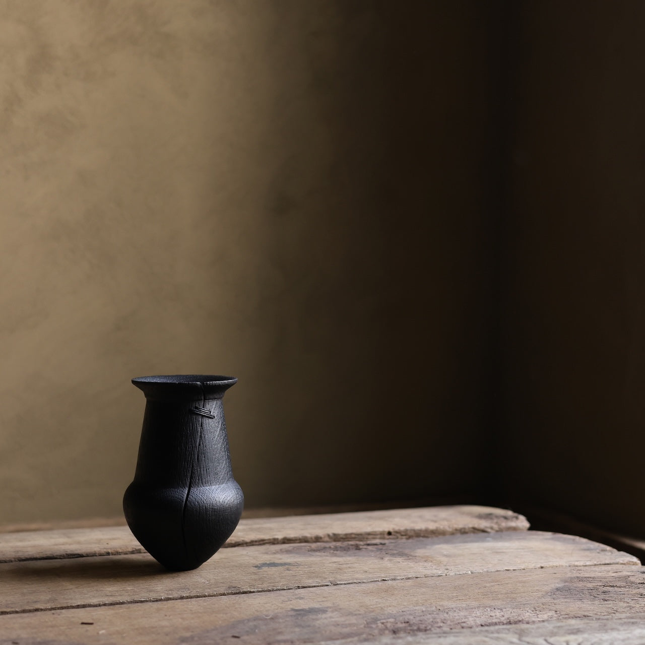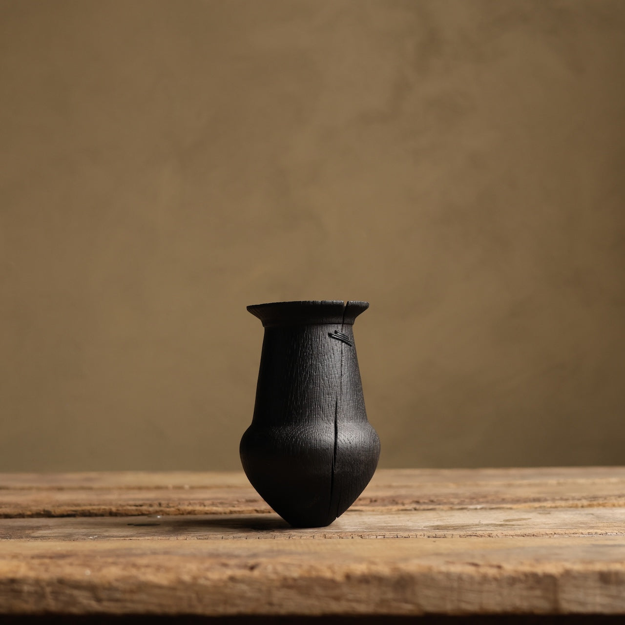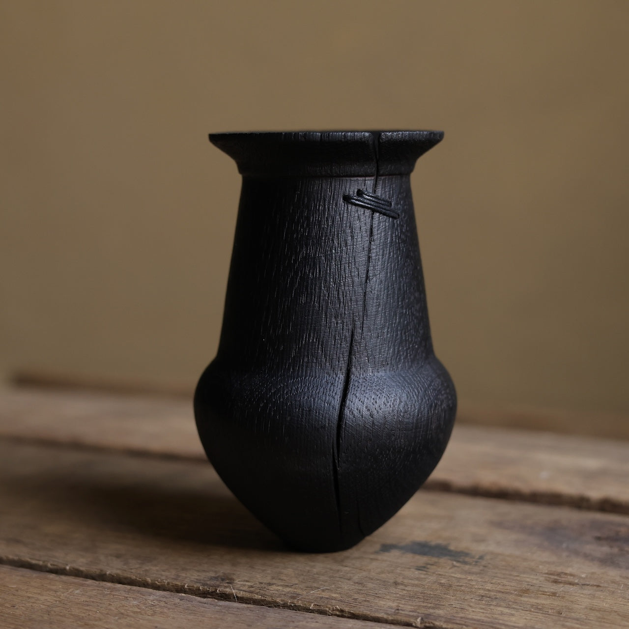 Deeply charred oak vessel that was brushed back to reveal the texture of the grain before coating with danish oil and wax and then burnishing with a stiff brush. Finally it’s mended with our signature stitchwork repair.