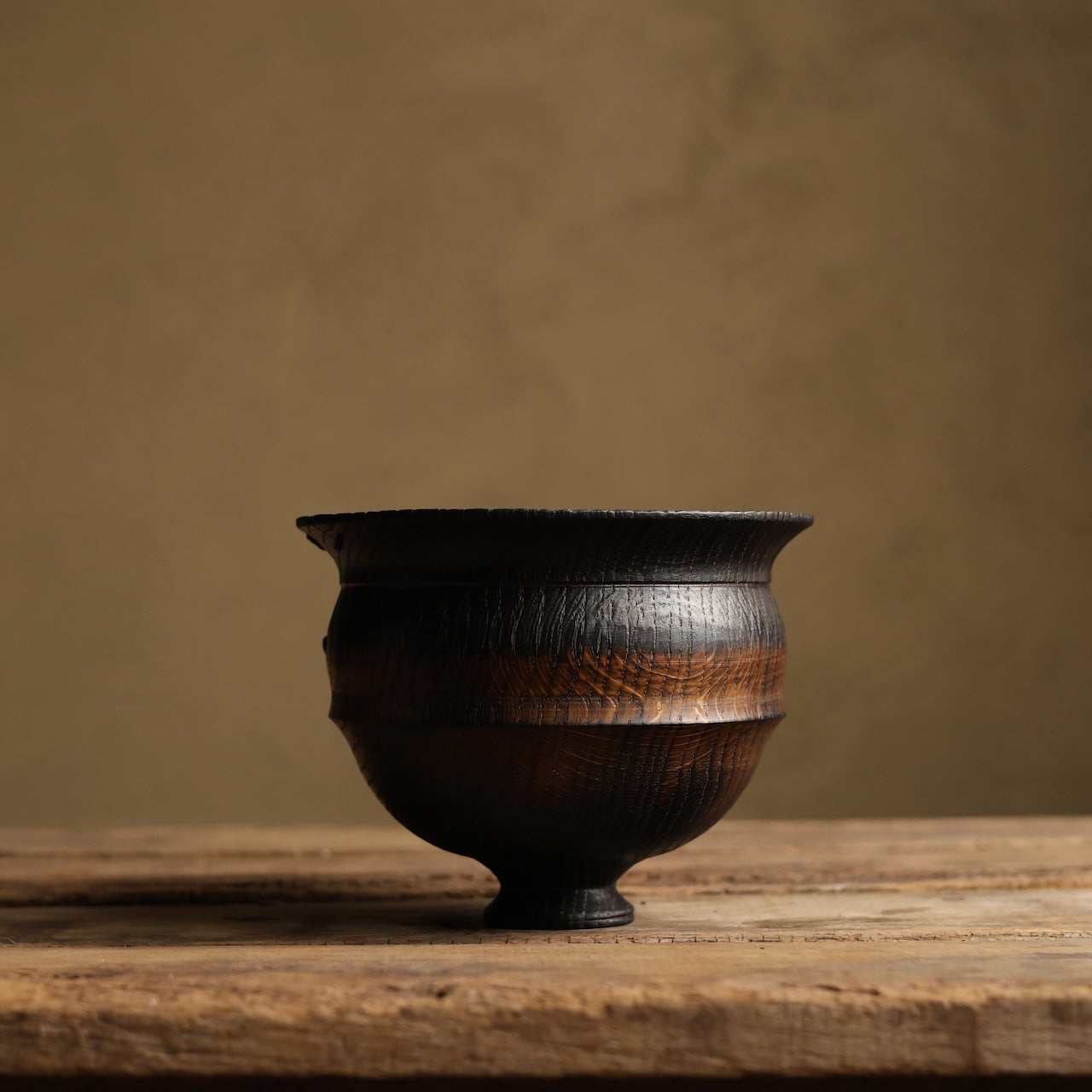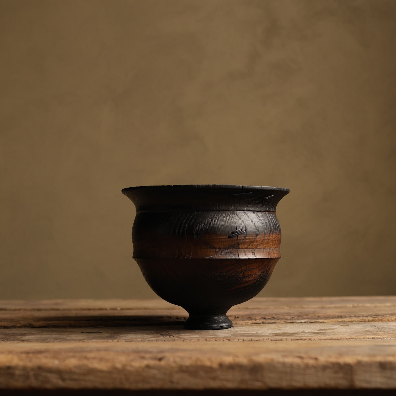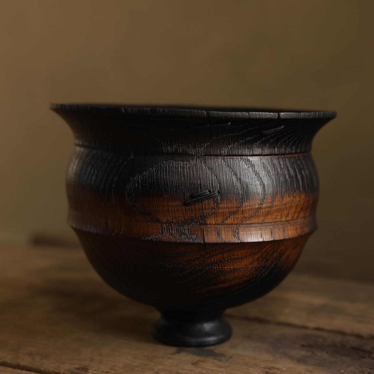 Patinated Oak vessel treated with lime and a touch of fire before coating with danish oil and wax and then repaired with our signature waxed cotton stitchwork.