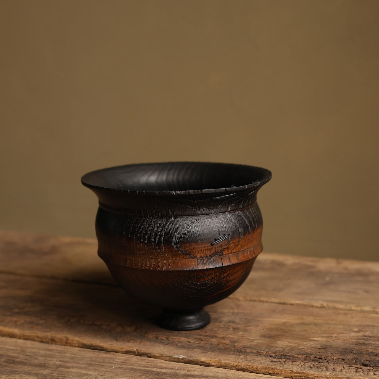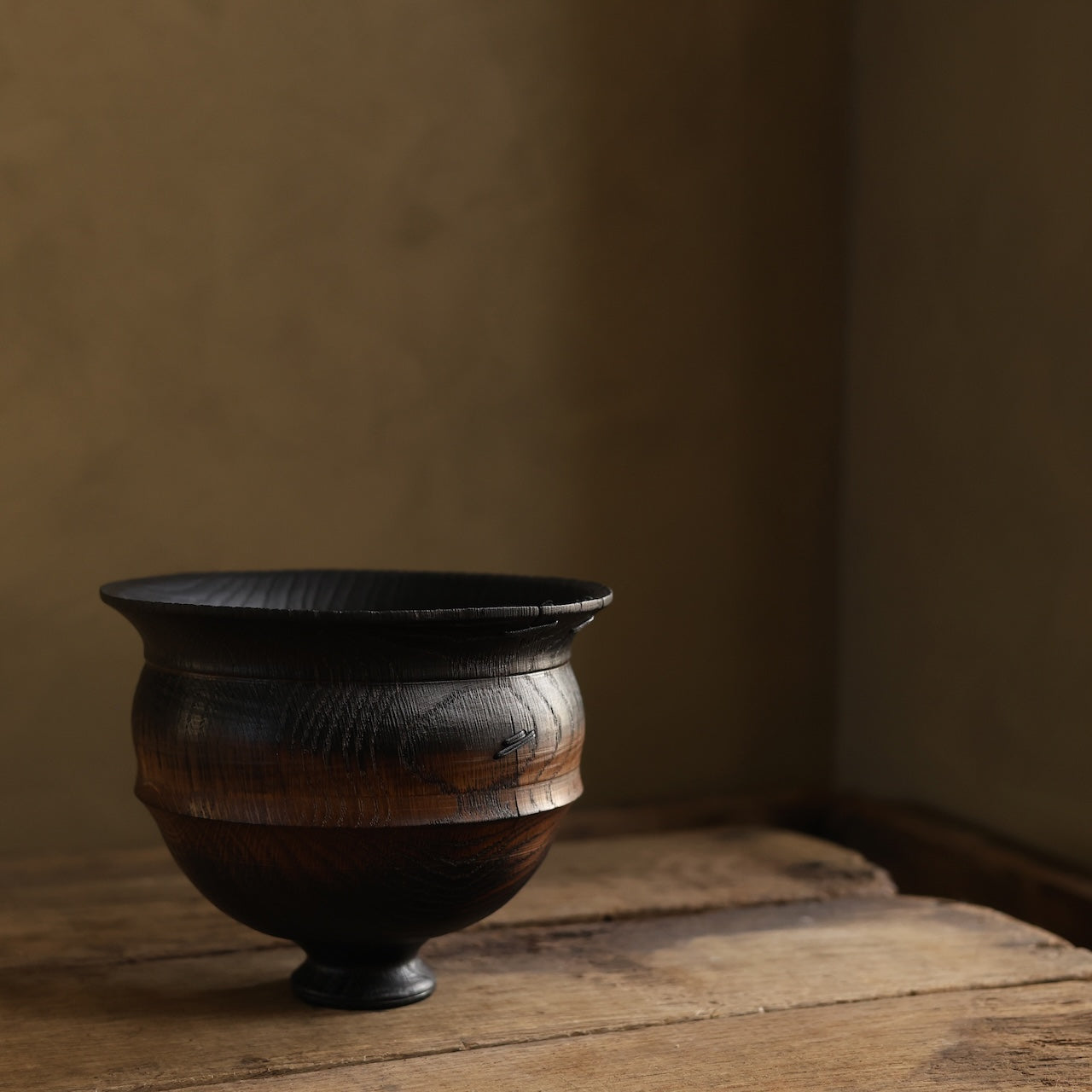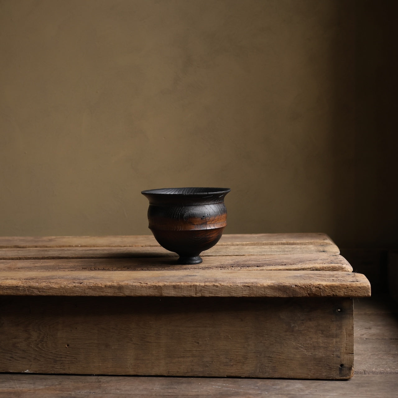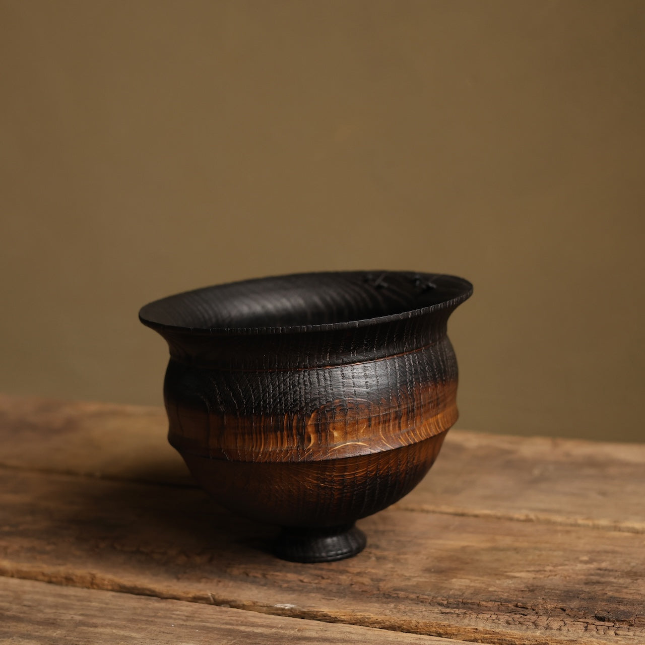 Patinated Oak vessel treated with lime and a touch of fire before coating with danish oil and wax and then repaired with our signature waxed cotton stitchwork.