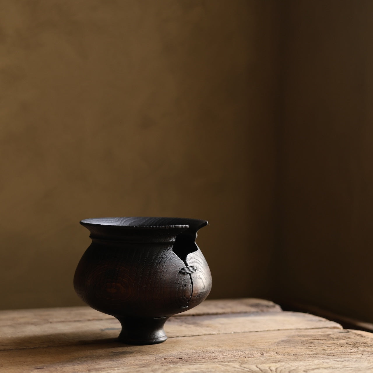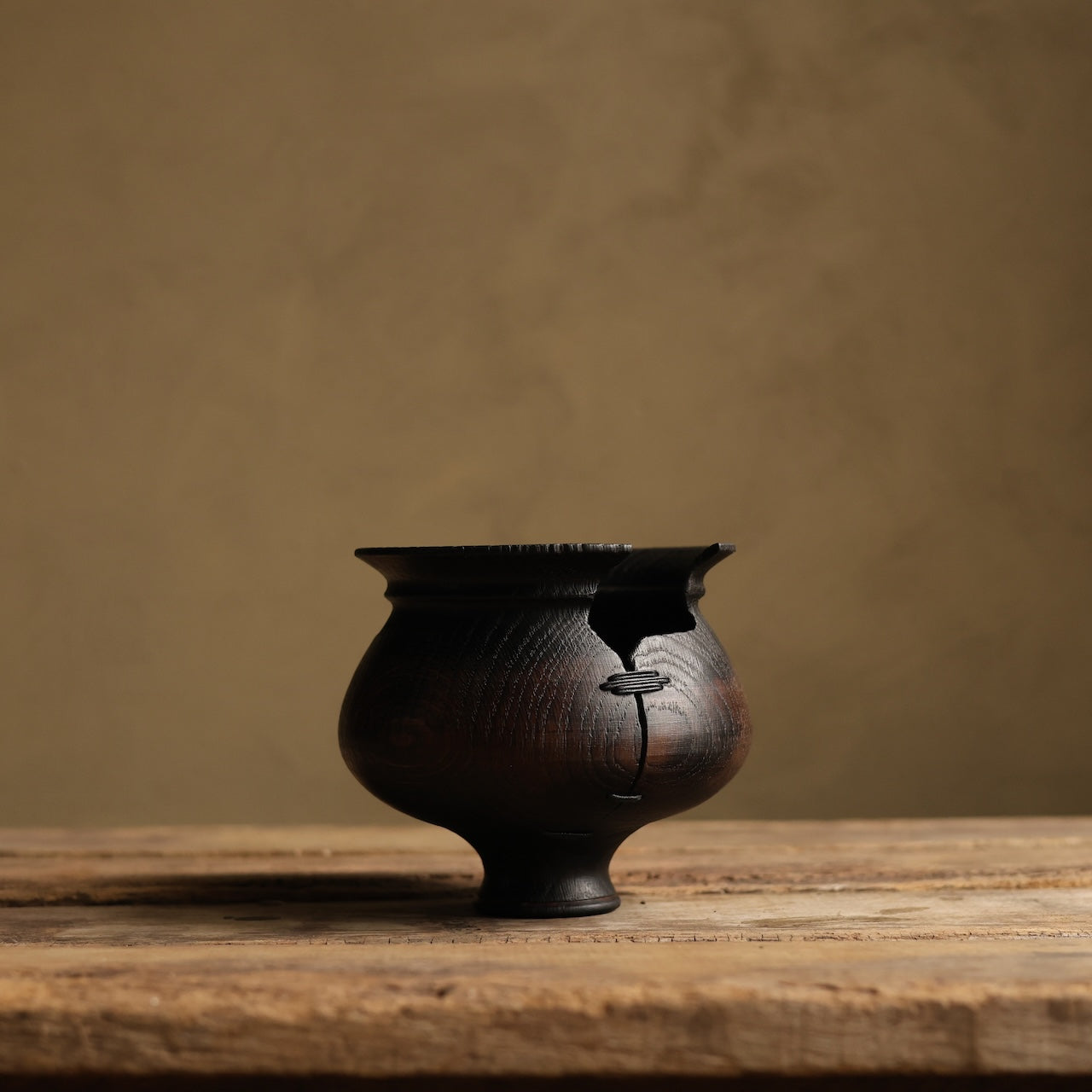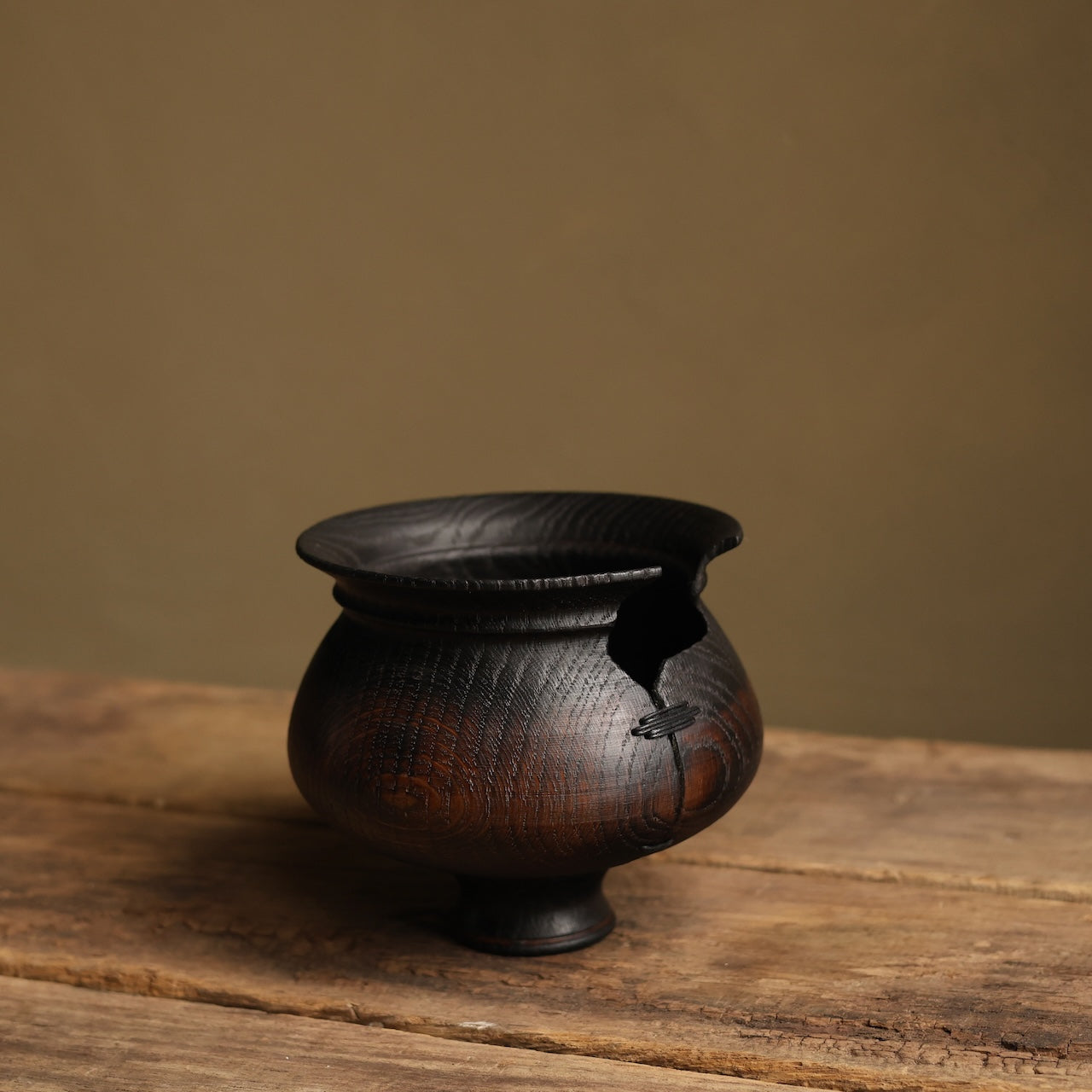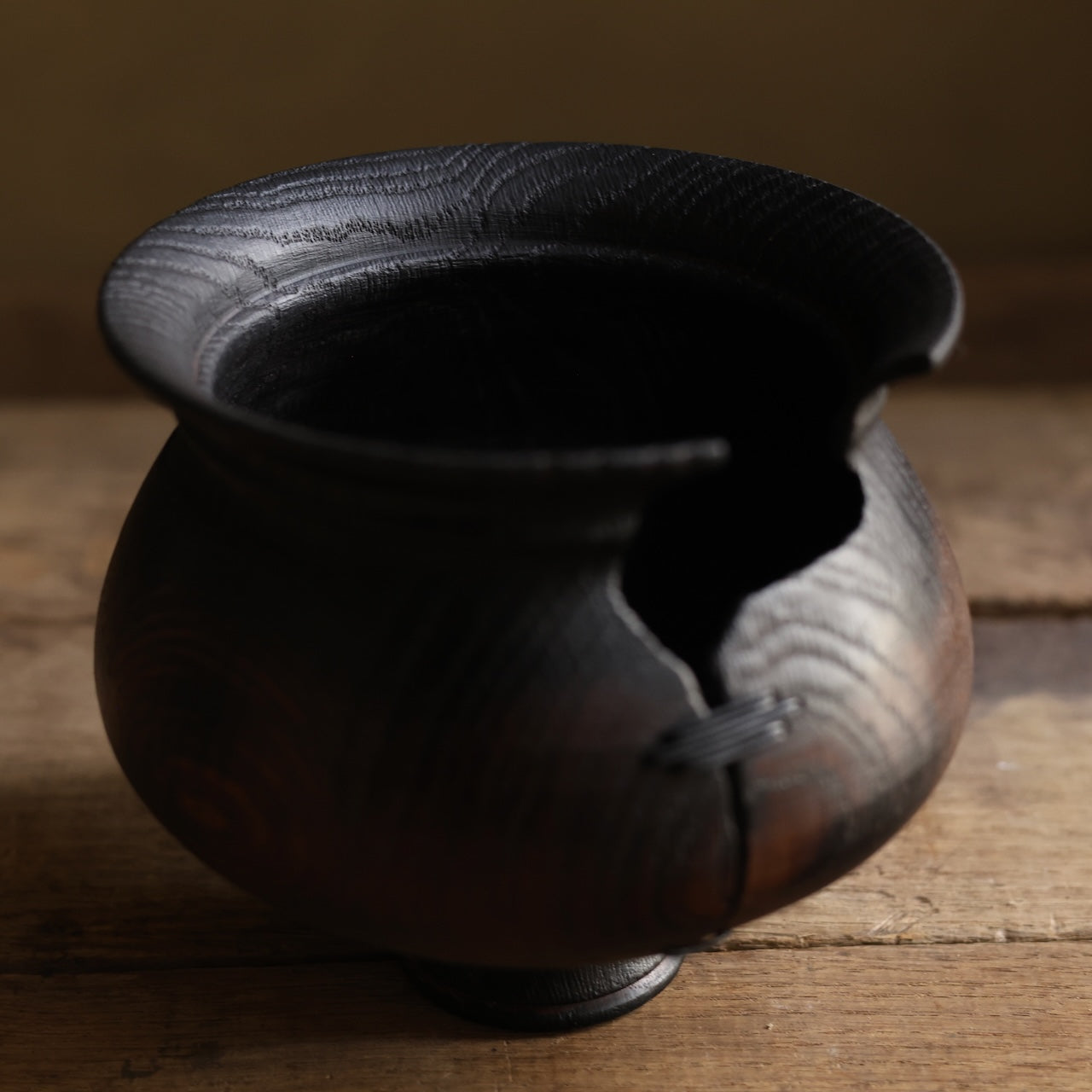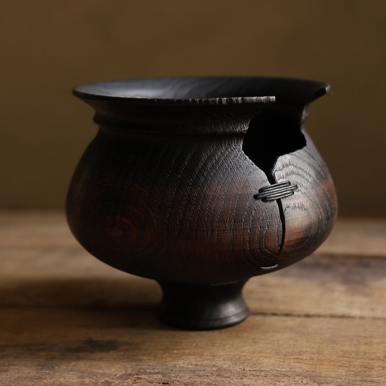 Patinated Oak vessel treated with lime and a touch of fire before coating with danish oil and wax and then repaired with our signature waxed cotton stitchwork.