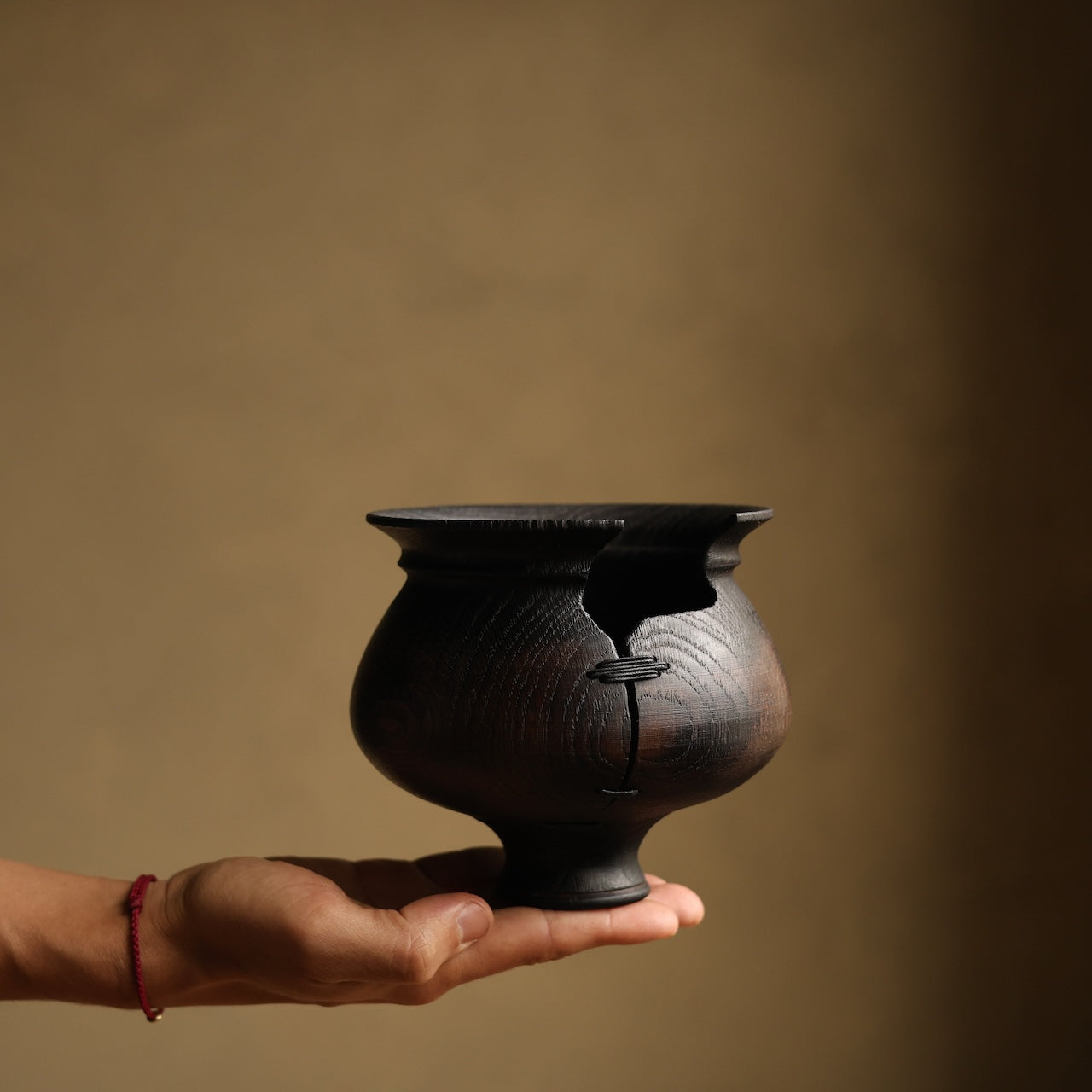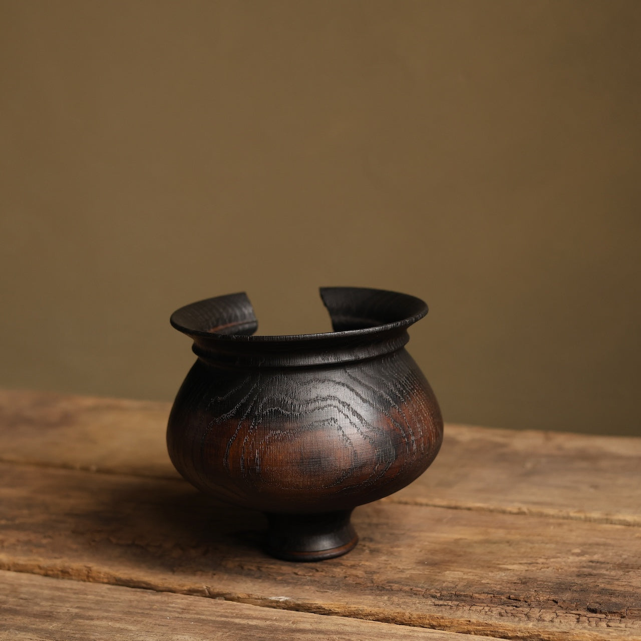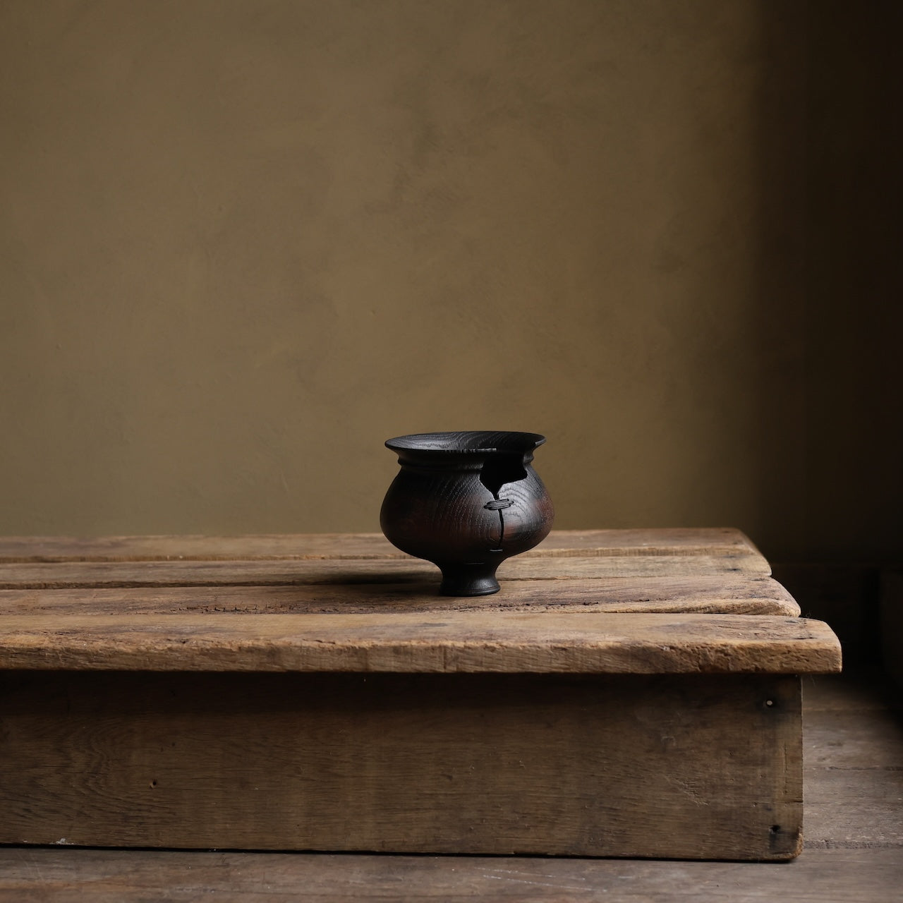 Our Chalice, is an oversized take on the original drinking vessel and another example of a piece with the flared foot we’ve been exploring on certain forms recently. This particular incarnation features a spectacular void that was caused by natural fractures in the wood and eroded by fire.