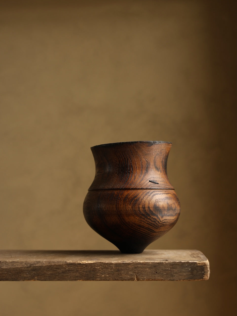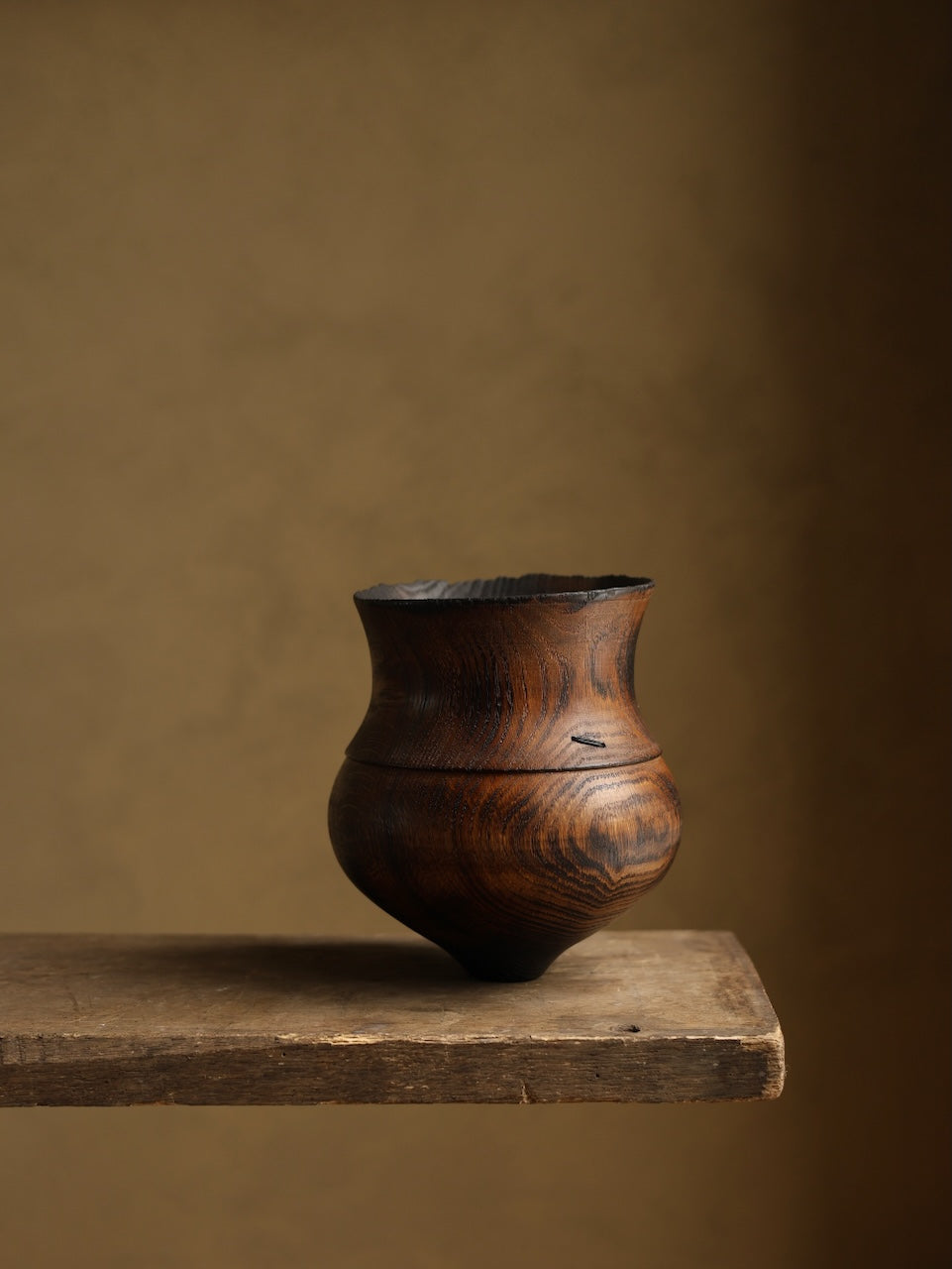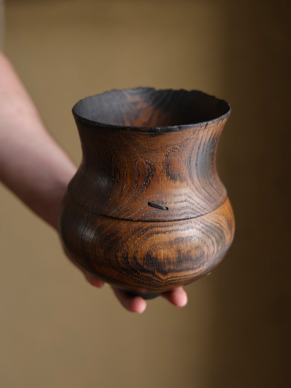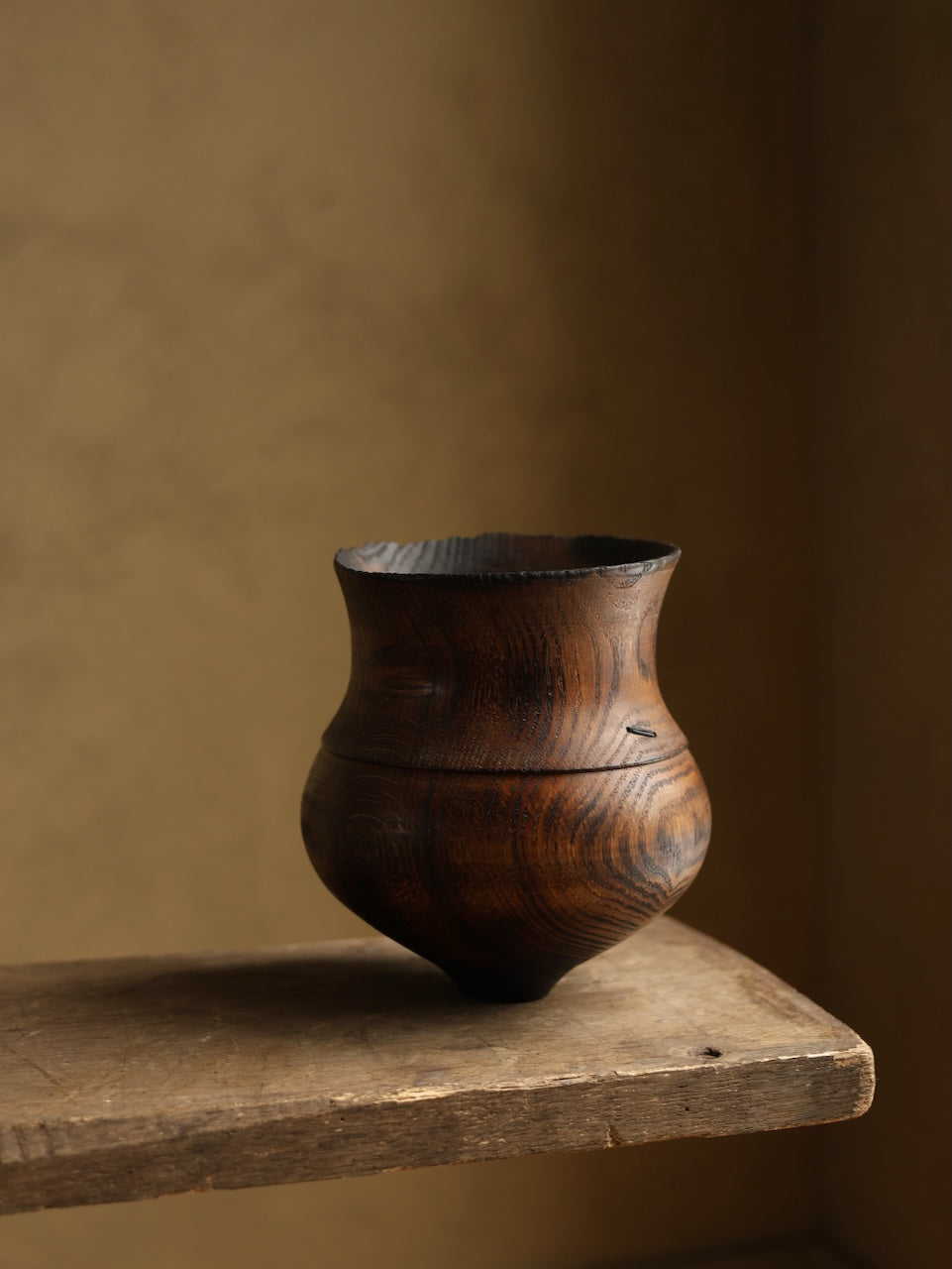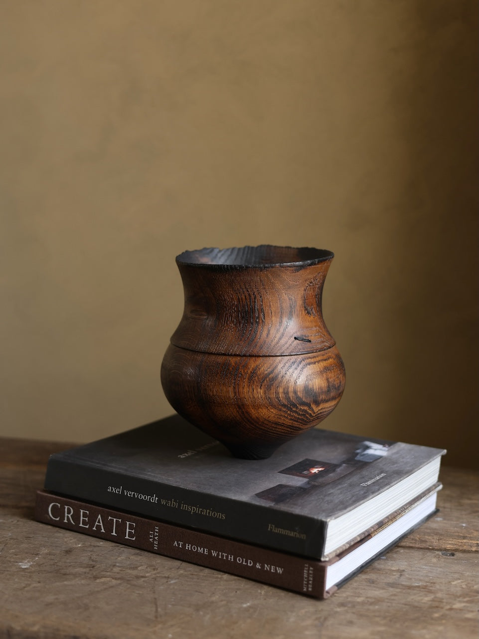 Amphora in our very lightly charred limed finish that has a rim subtly eroded by fire and a surface lightly touched by the flame. The piece is then subtly polished before rinsing in a lime solution and being washed. It is then coated in a UV protective Danish Oil and buffed with Renaissance wax before a thorough burnishing with a very stiff brush to create a rich textured surface. Finally any natural fissures and imperfections are celebrated through mending with waxed cotton stitch-work.