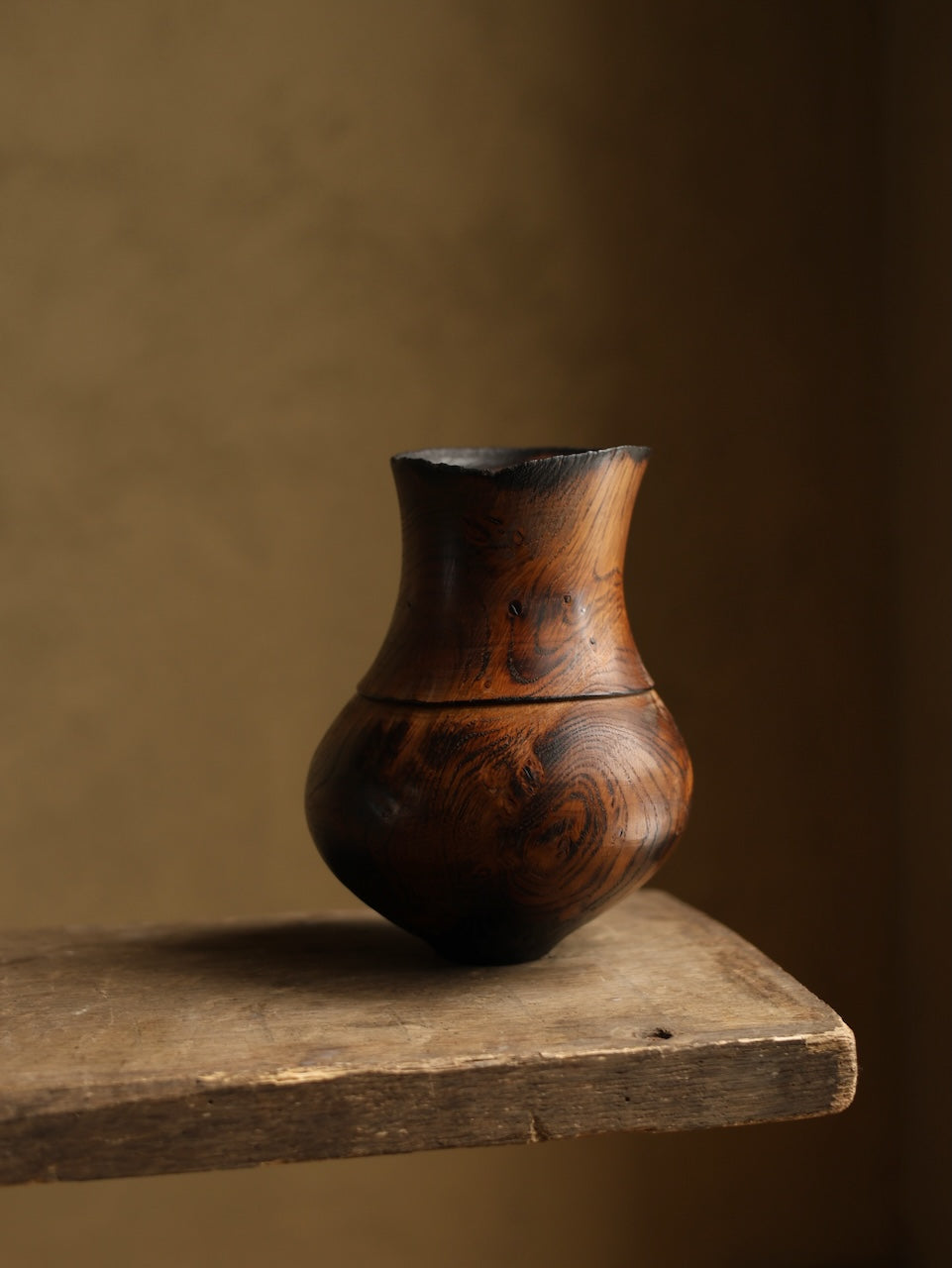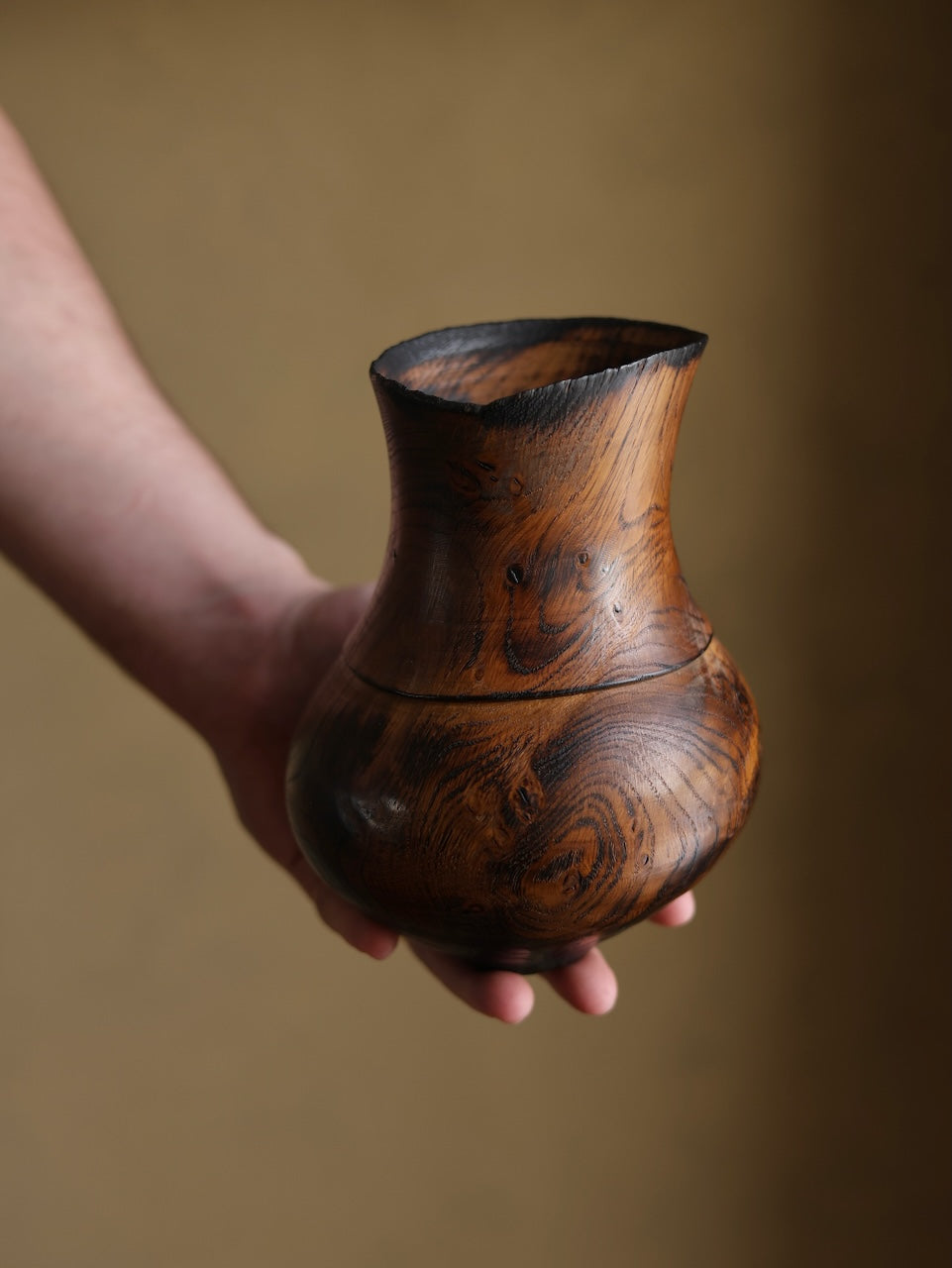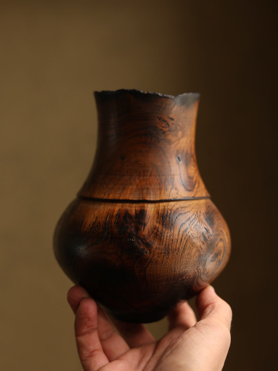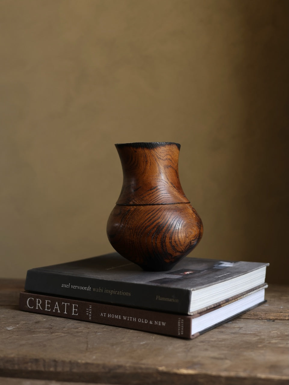 Amphora in our very lightly charred limed finish that has a rim subtly eroded by fire and a surface lightly touched by the flame. The piece is then subtly polished before rinsing in a lime solution and being washed. It is then coated in a UV protective Danish Oil and buffed with Renaissance wax before a thorough burnishing with a very stiff brush to create a rich textured surface.