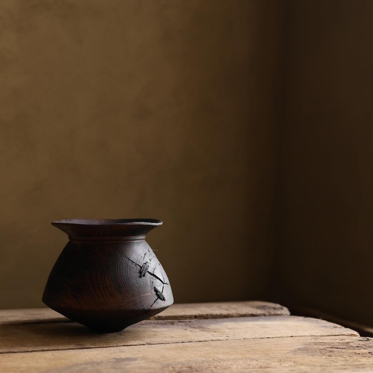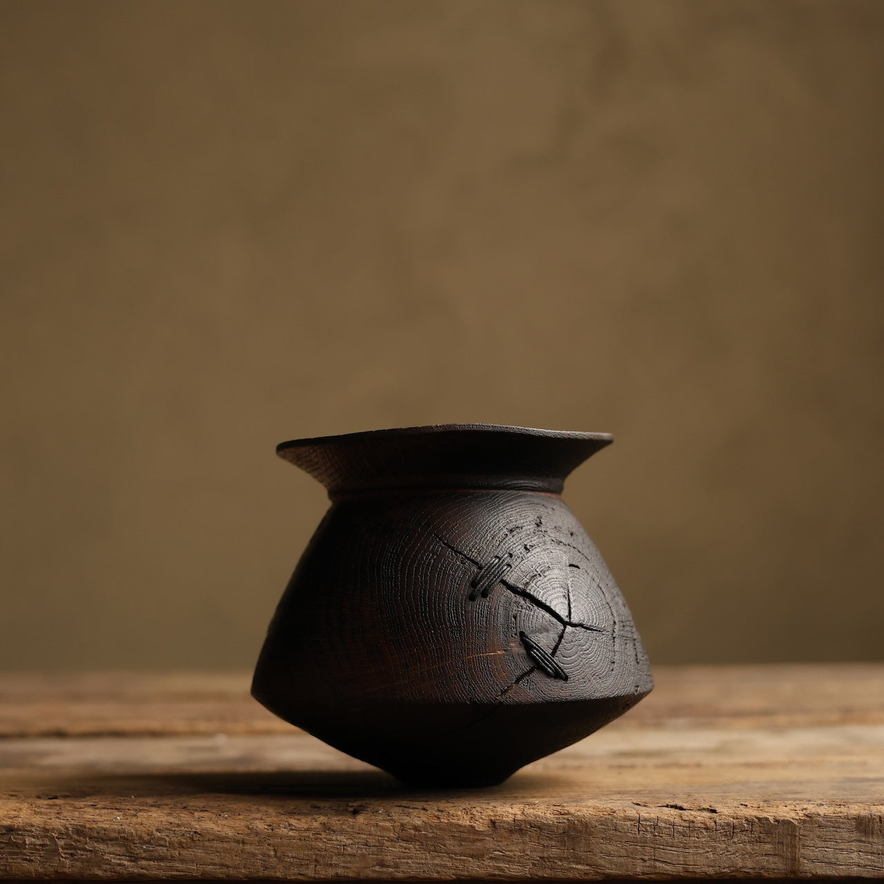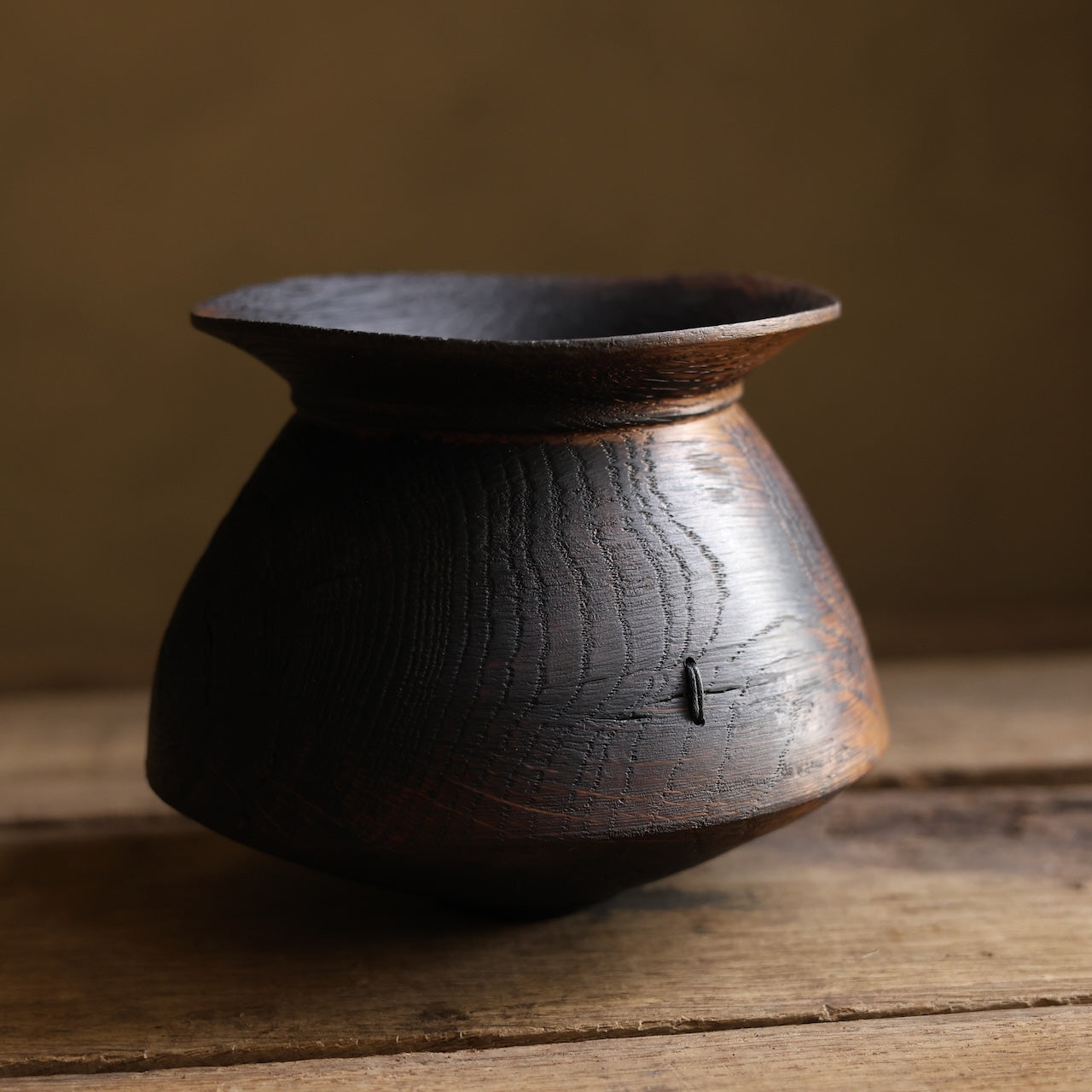 Patinated Oak vessel treated with lime and a touch of fire before coating with danish oil and wax and then repaired with our signature waxed cotton stitchwork.