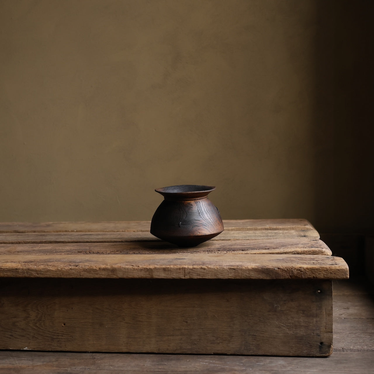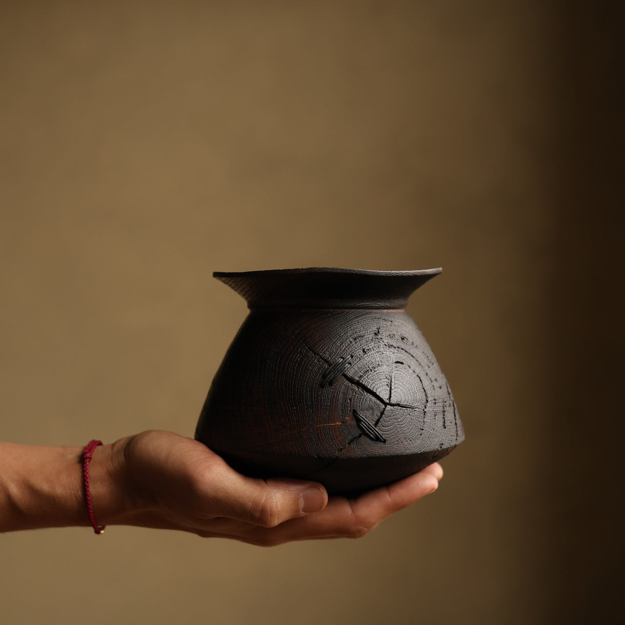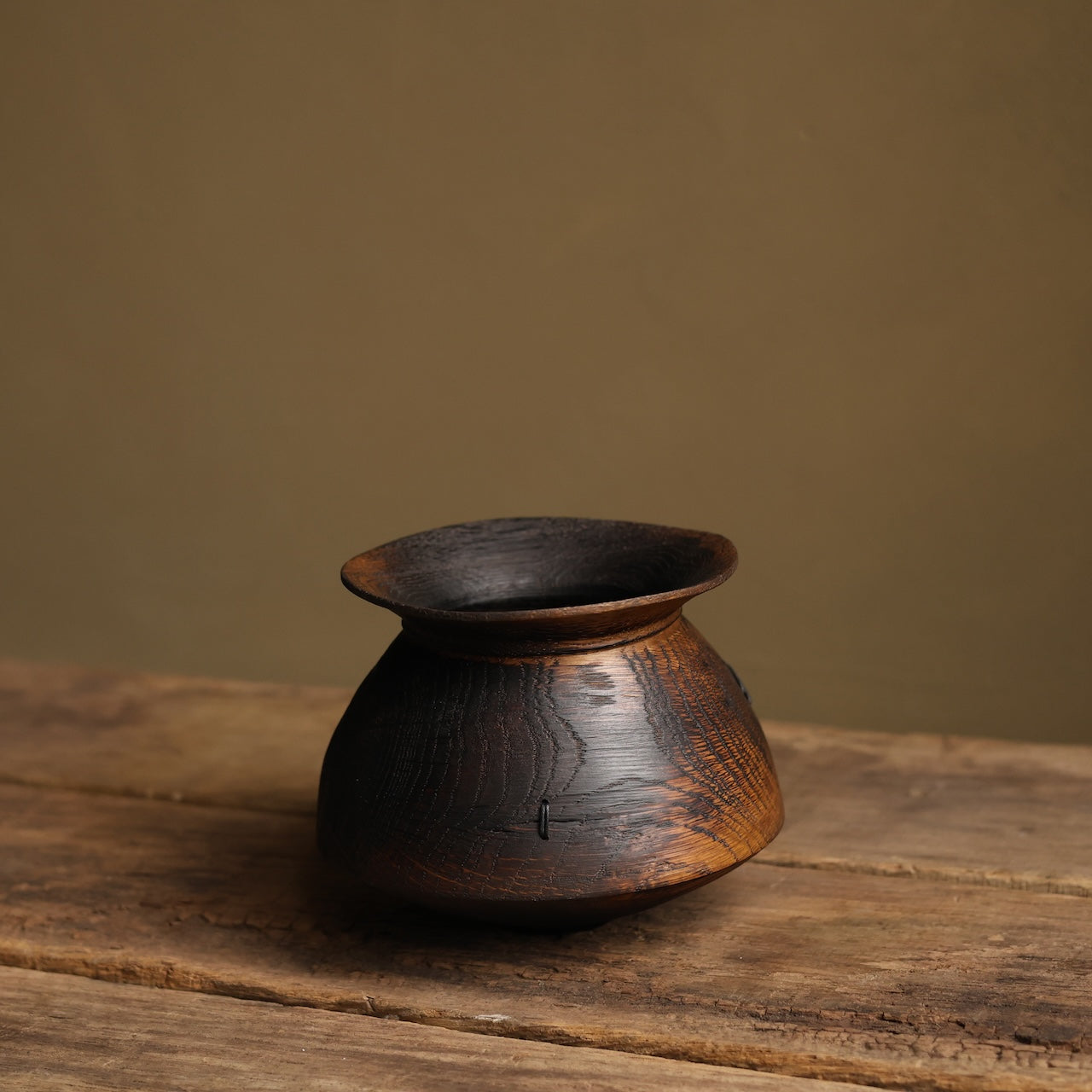 Patinated Oak vessel treated with lime and a touch of fire before coating with danish oil and wax and then repaired with our signature waxed cotton stitchwork.