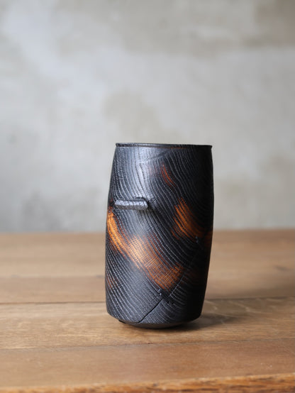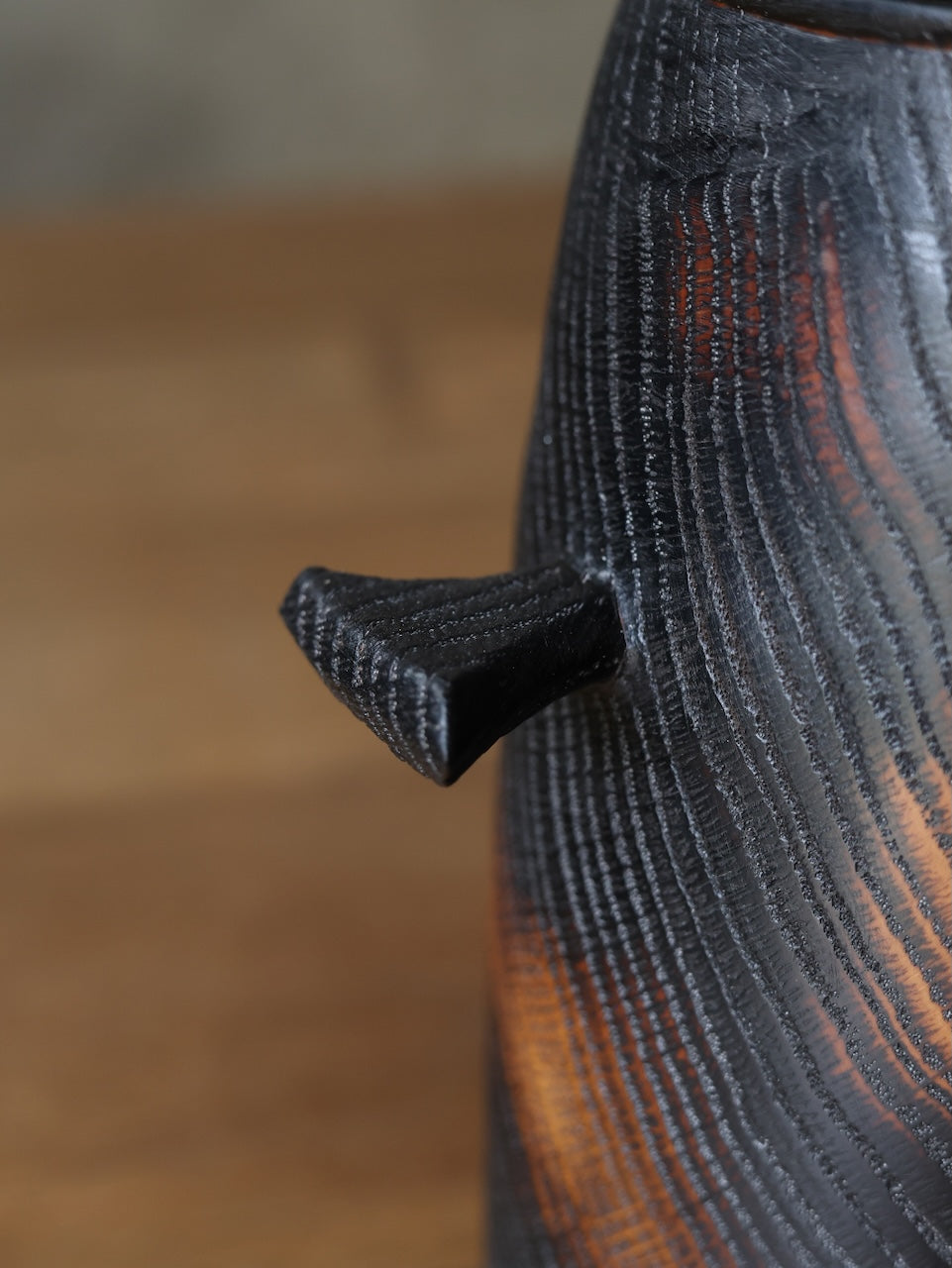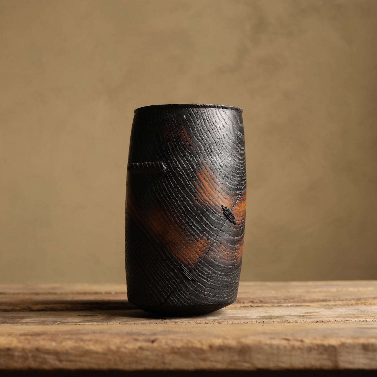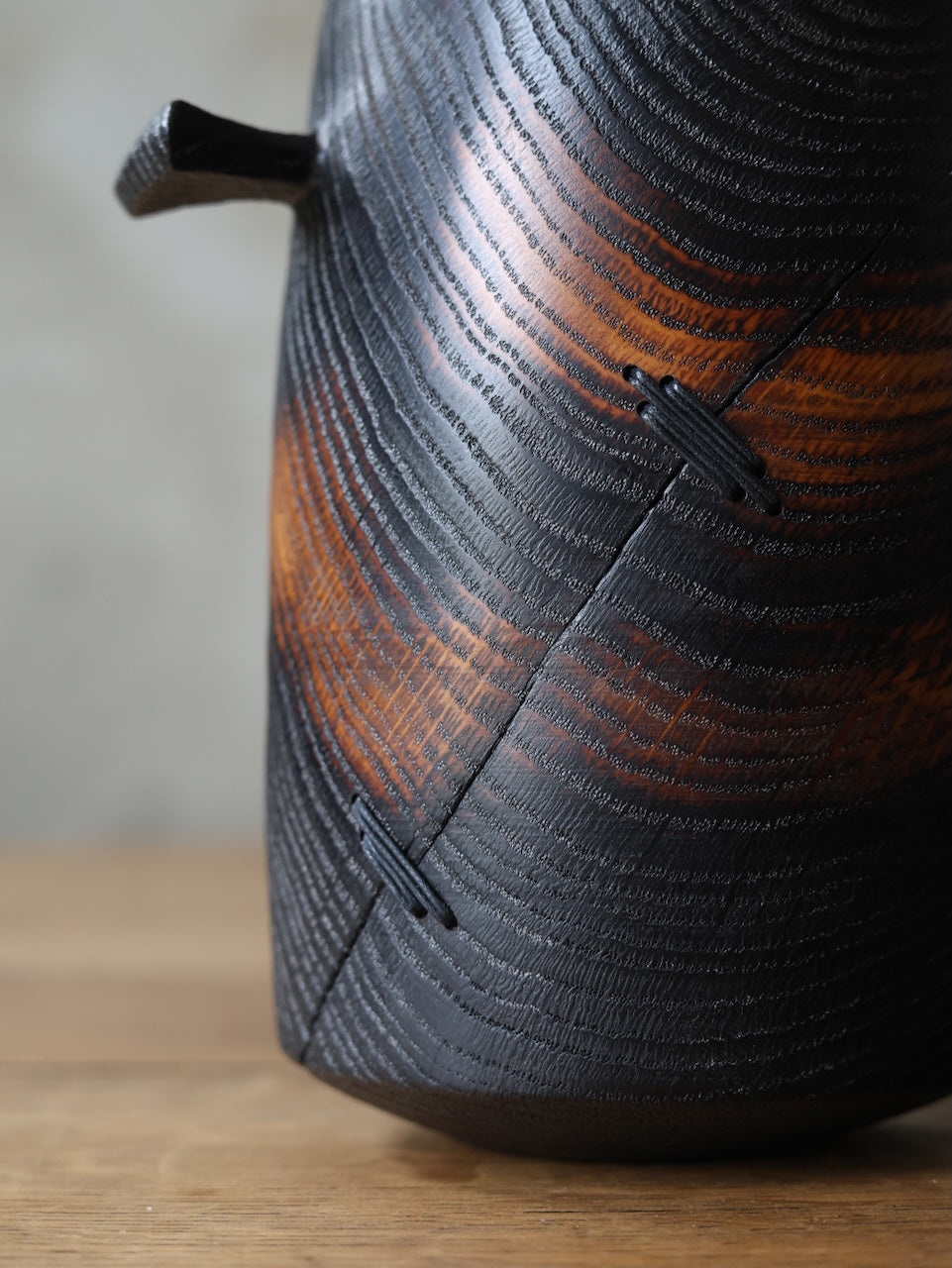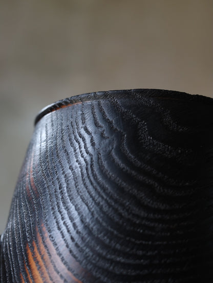 This piece features our Smoke patina, a surface that has been selectively scorched with fire before brushing to remove the loose particulate and revealing the texture of the natural grain beneath. We then polish parts of the surface with a fine sandpaper before rinsing the piece in a natural lime wash that reacts with the Oak’s tannins to create a rich amber hue that intersperses the blackened surface.