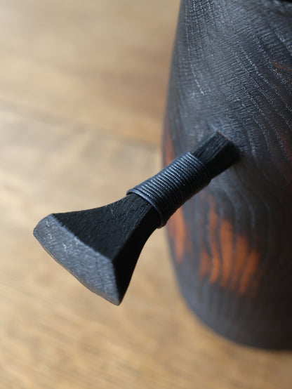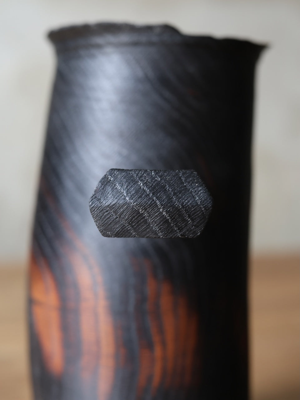 This piece features our Smoke patina, a surface that has been selectively scorched with fire before brushing to remove the loose particulate and revealing the texture of the natural grain beneath. We then polish parts of the surface with a fine sandpaper before rinsing the piece in a natural lime wash that reacts with the Oak’s tannins to create a rich amber hue that intersperses the blackened surface.